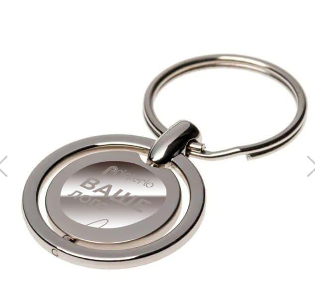 Металлический брелок круглой формы с вращающейся центральной частью. Оснащен кольцом для ключей.