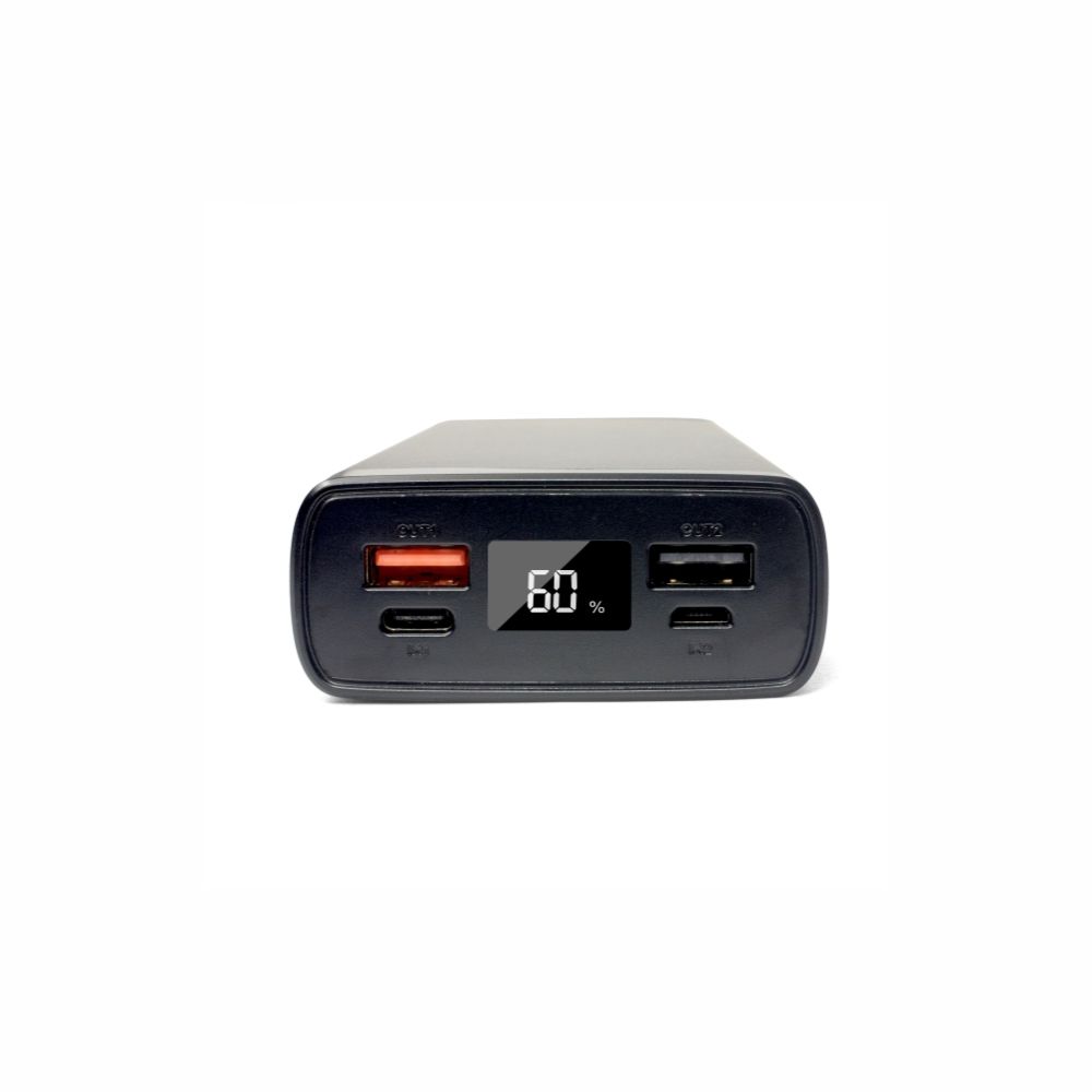 Емкость повербанка — 20000 mAh. Количество заряда модели в процентах отображается на светодиодном дисплее на нижней панели.