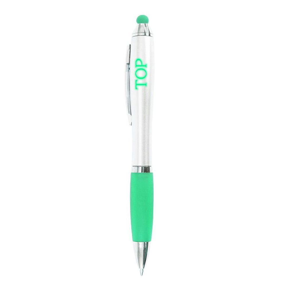 Самое время удивиться. На корпусе ручки имеется специальная зона с подсветкой. Она поможет выгодно преподнести ваш логотип. Подстветка включается кнопкой на тубусе ручки. Интересно смотрится двуцветность решения. Удобная в письме. В зоне контакта с рукой есть цветная резинка. На клипе стилус