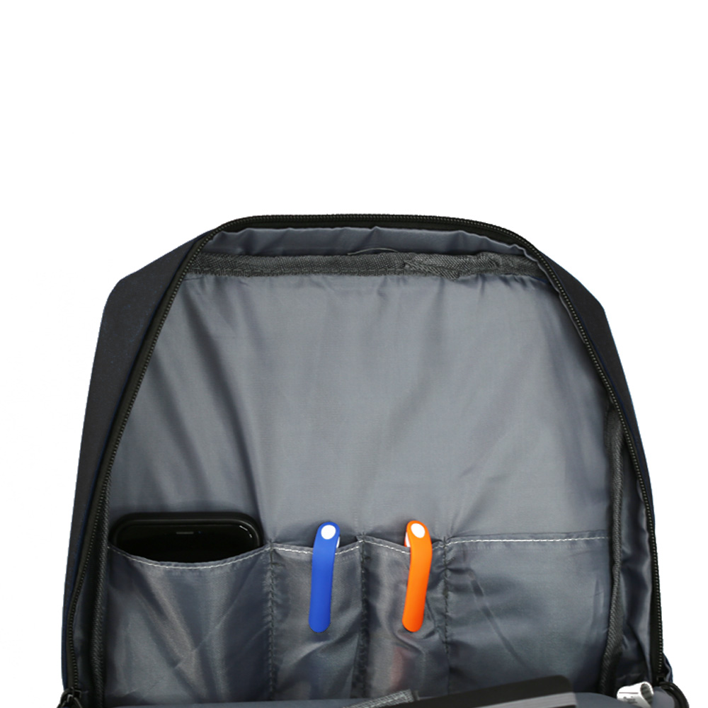 Рюкзак имеет продуманную конструкцию: внутри большое отделение с мягким карманом для ноутбука, два открытых кармана для мелочей и карточек, а также маленькие кармашки для ручек. Снаружи расположены два вместительных кармана на молнии для быстрого доступа и один боковой карман для мелких предметов.