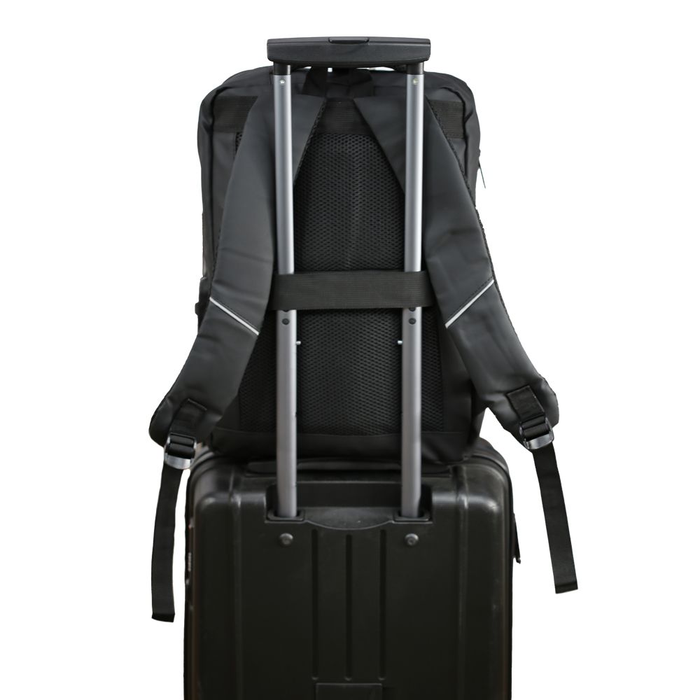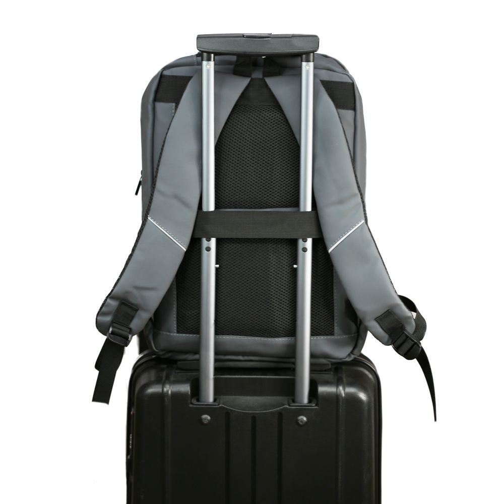 - Удобная спинка с эластичным ремнем для фиксации рюкзака на ручке чемодана. Модель оснащена мягкой ручкой и ручкой-петлей.