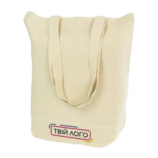 Полотняная сумка плотностью 170 г/м² с цветными ручками и элементами внизу. Сумка имеет одно основное отделение, широкое дно, а внутри — дополнительный карман для телефона или мелочей.