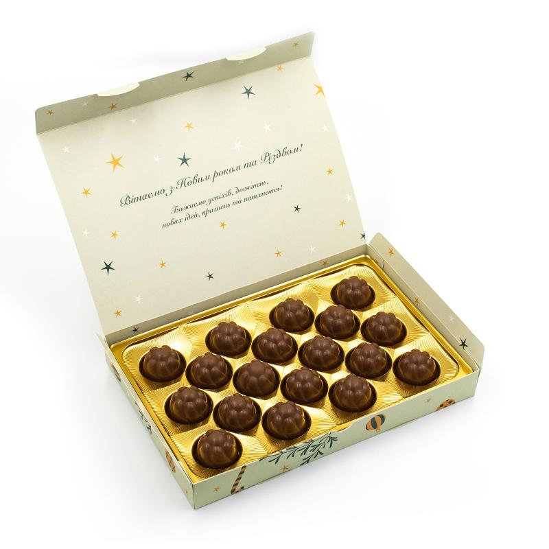 Коробка цукерок Gold Nut вагою 205 г — стильний подарунок для поціновувачів шоколаду. Усередині — шоколадні цукерки з цілим лісовим горіхом. Коробка виготовлена з якісного картону щільністю 230 г. Можливі варіанти друку — односторонній, двосторонній або преміум із застосуванням золотого чи срібного тиснення, а також матове або глянцеве ламінування. Розмір упаковки: 220 × 150 × 27 мм, вага — 205 г. Чудово підходить для подарунків і презентацій.