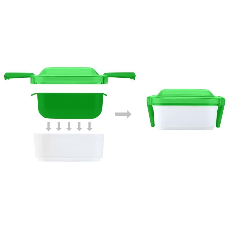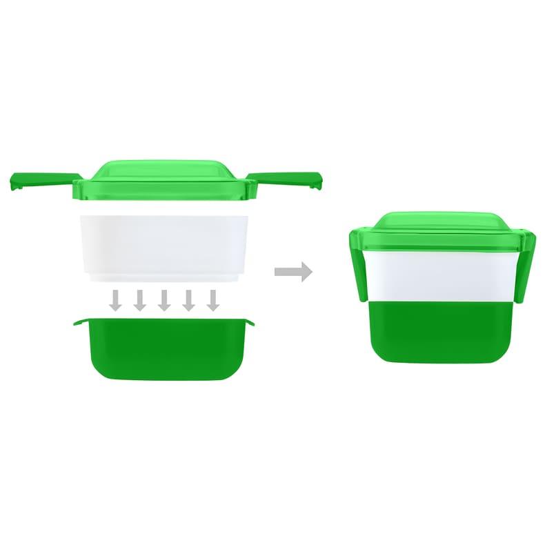 Ланчбокс складається з двох окремих контейнерів, що дозволяє зручно розділяти різні страви. Компактний дизайн у складеному вигляді робить його зручним для перенесення в сумці або рюкзаку, а збільшений об’єм у розкладеному вигляді забезпечує комфортне розміщення повноцінного обіду. Кришка не призначена для використання в мікрохвильовій печі.