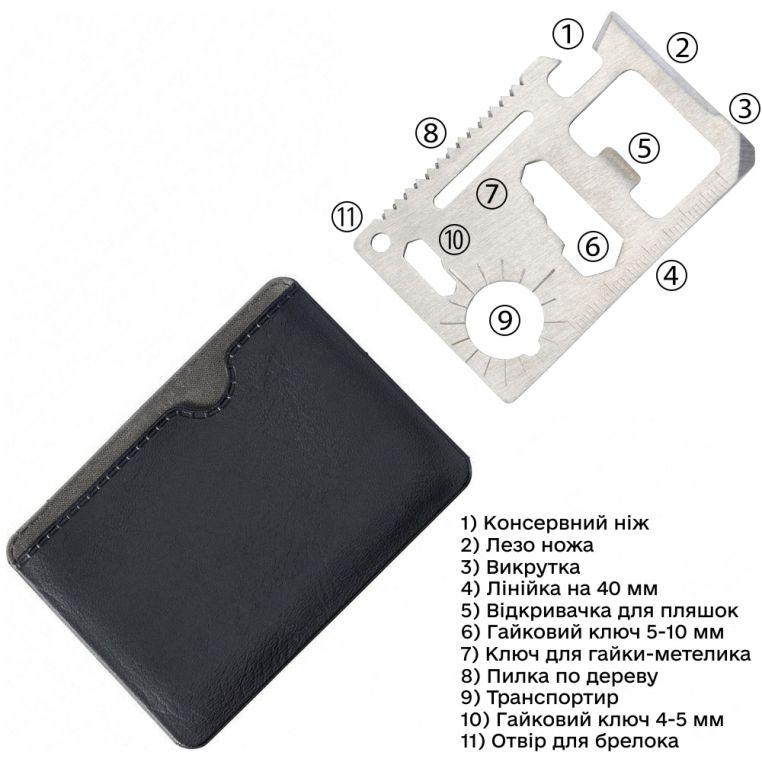 Компактний багатофункціональний інструмент у формі картки. Поставляється у чохлі зі шкірзаму PU. Поєднує у собі 11 інструментів: консервний ніж, лезо ножа, викрутку, лінійку на 40 мм, відкривачку для пляшок, гайковий ключ 5-10 мм, ключ для гайки-метелика, пилку по дереву, транспортир, гайковий ключ 4-5 мм та отвір для брелока.