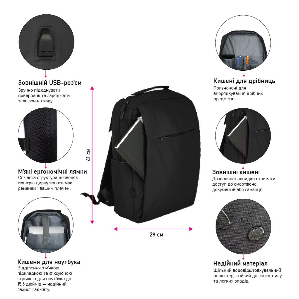 - Оптимальний об’єм — вміщує ноутбук, планшет, книги, пляшку з водою та інше.