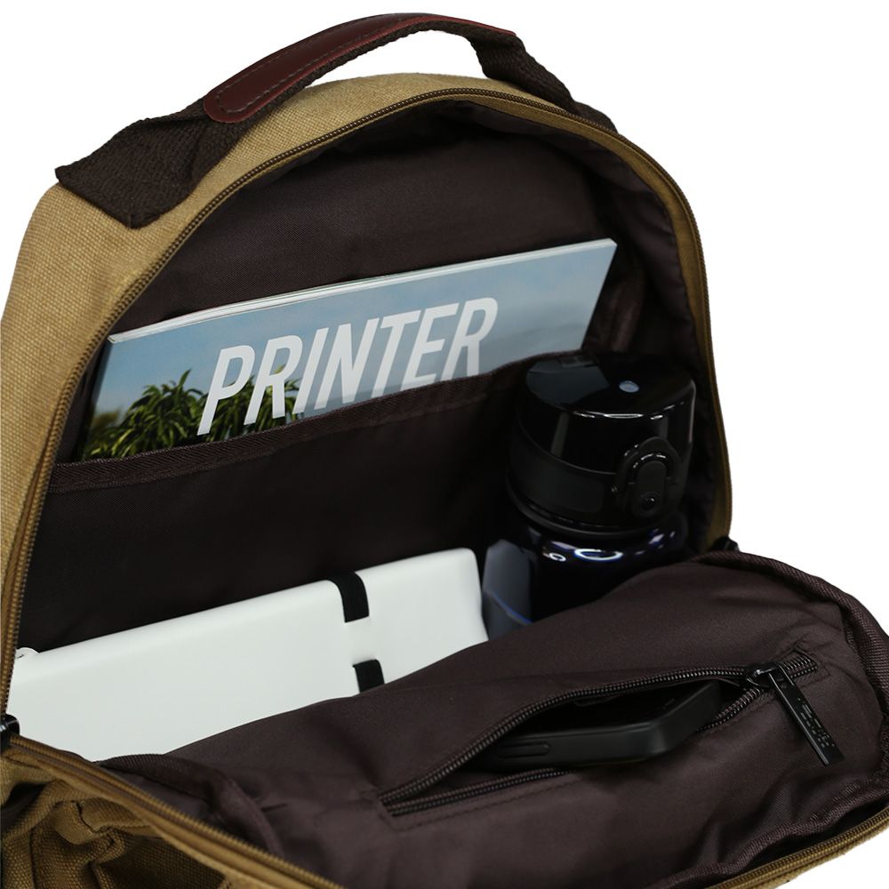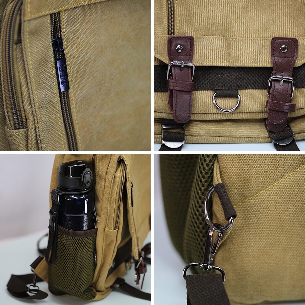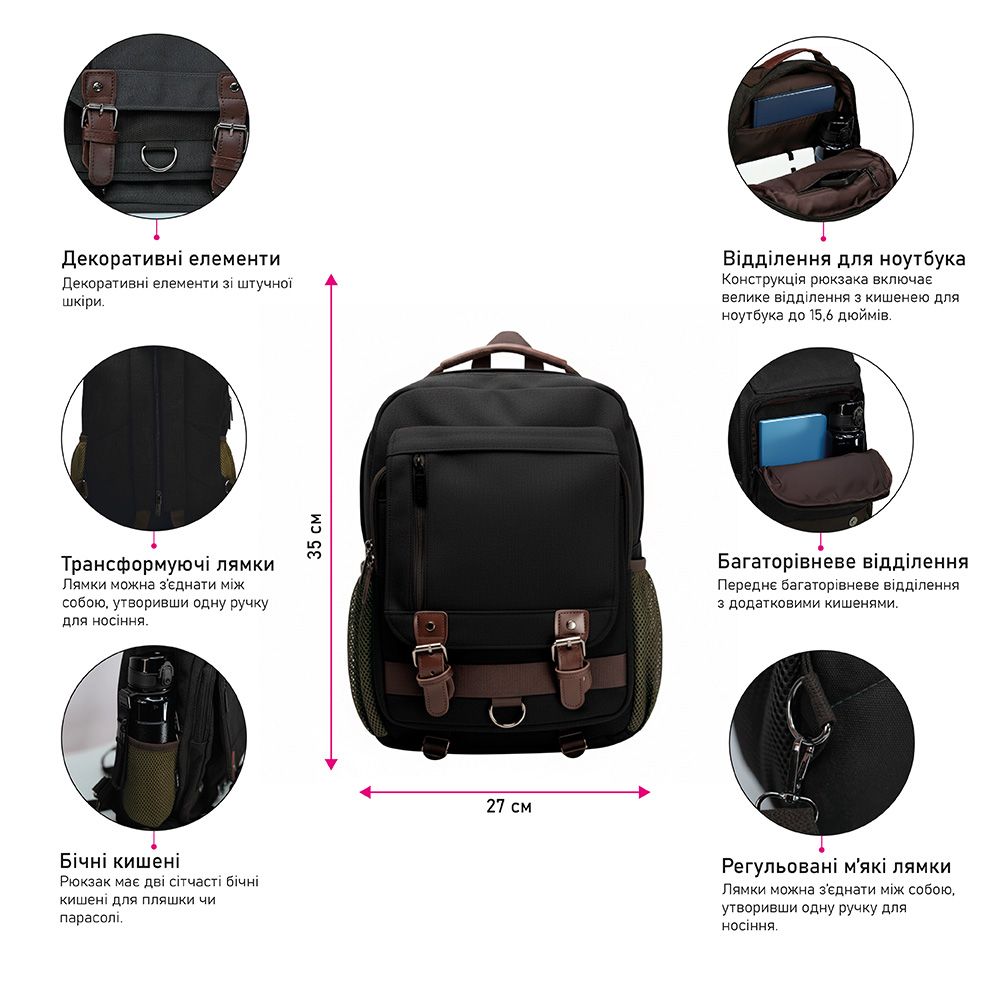 Конструкція рюкзака включає велике відділення з кишенею для ноутбука, переднє багаторівневе відділення з додатковими кишенями та дві сітчасті бічні кишені для пляшки чи парасолі. Лямки можна з’єднати між собою, утворивши одну ручку для носіння.