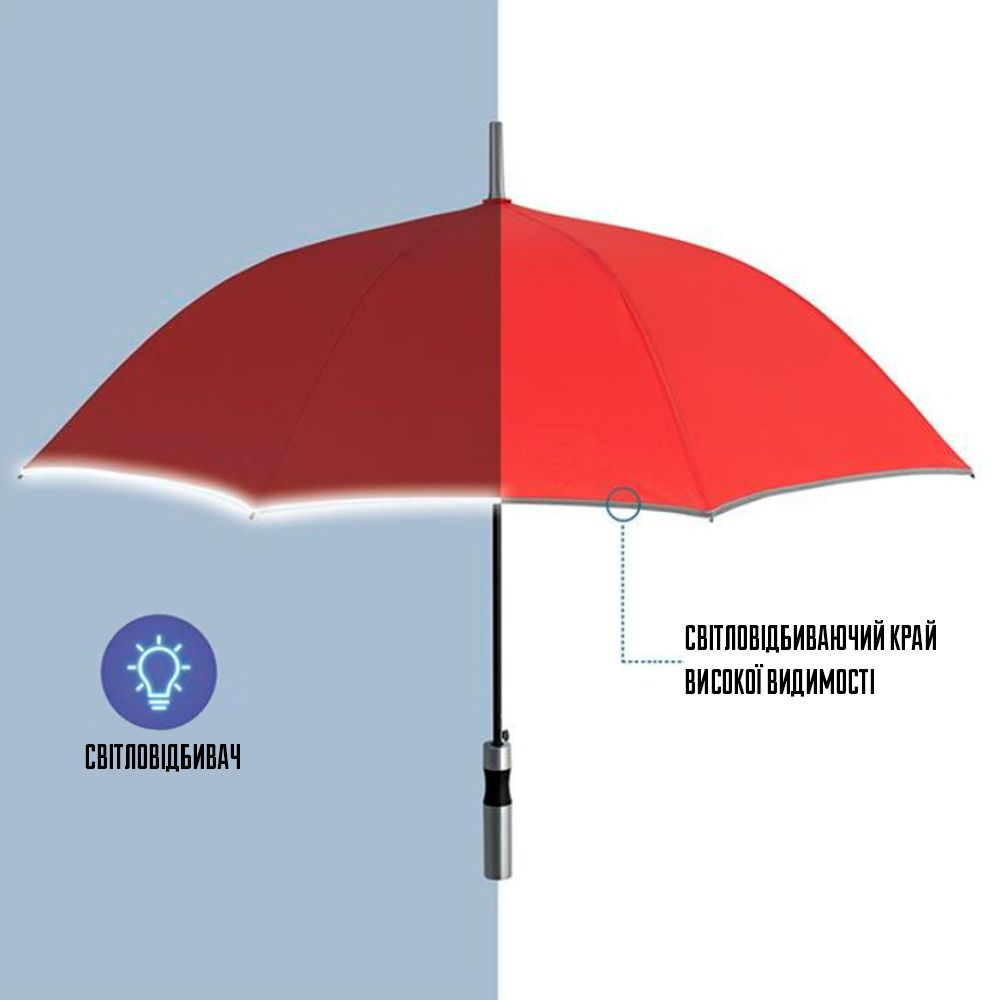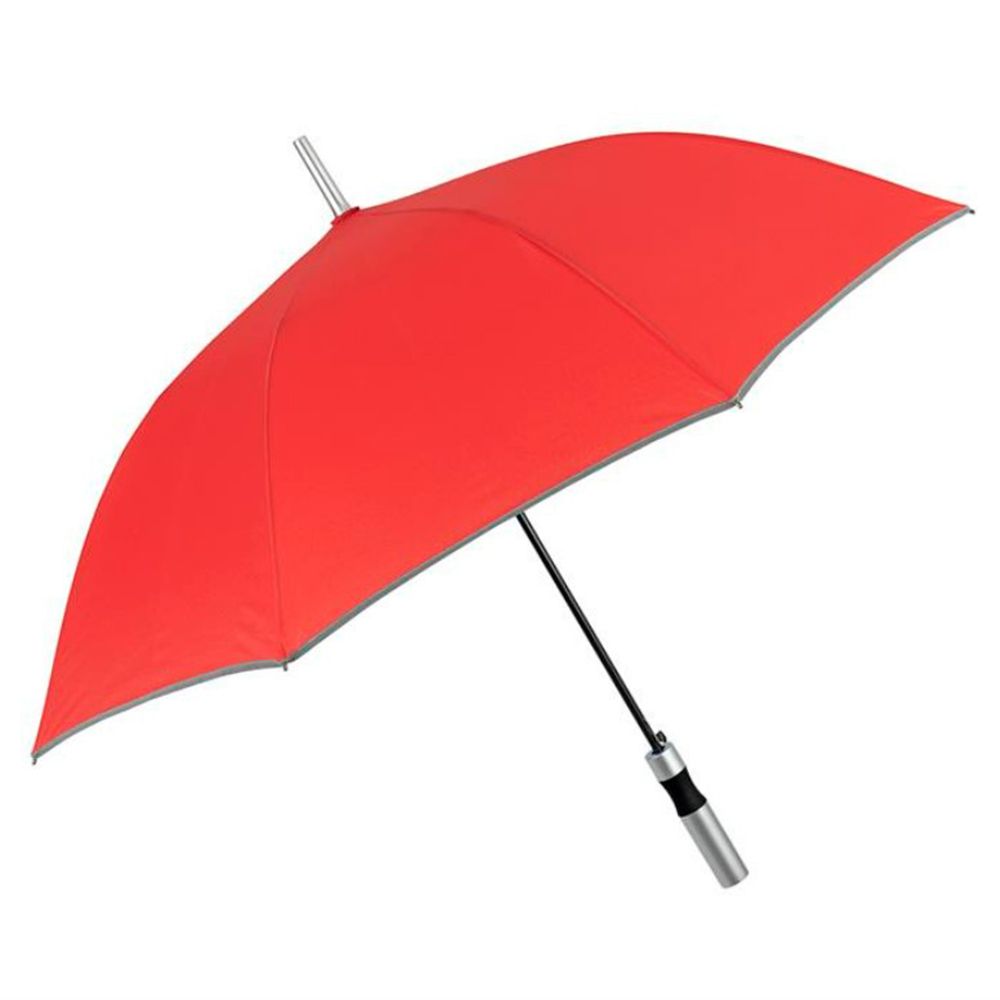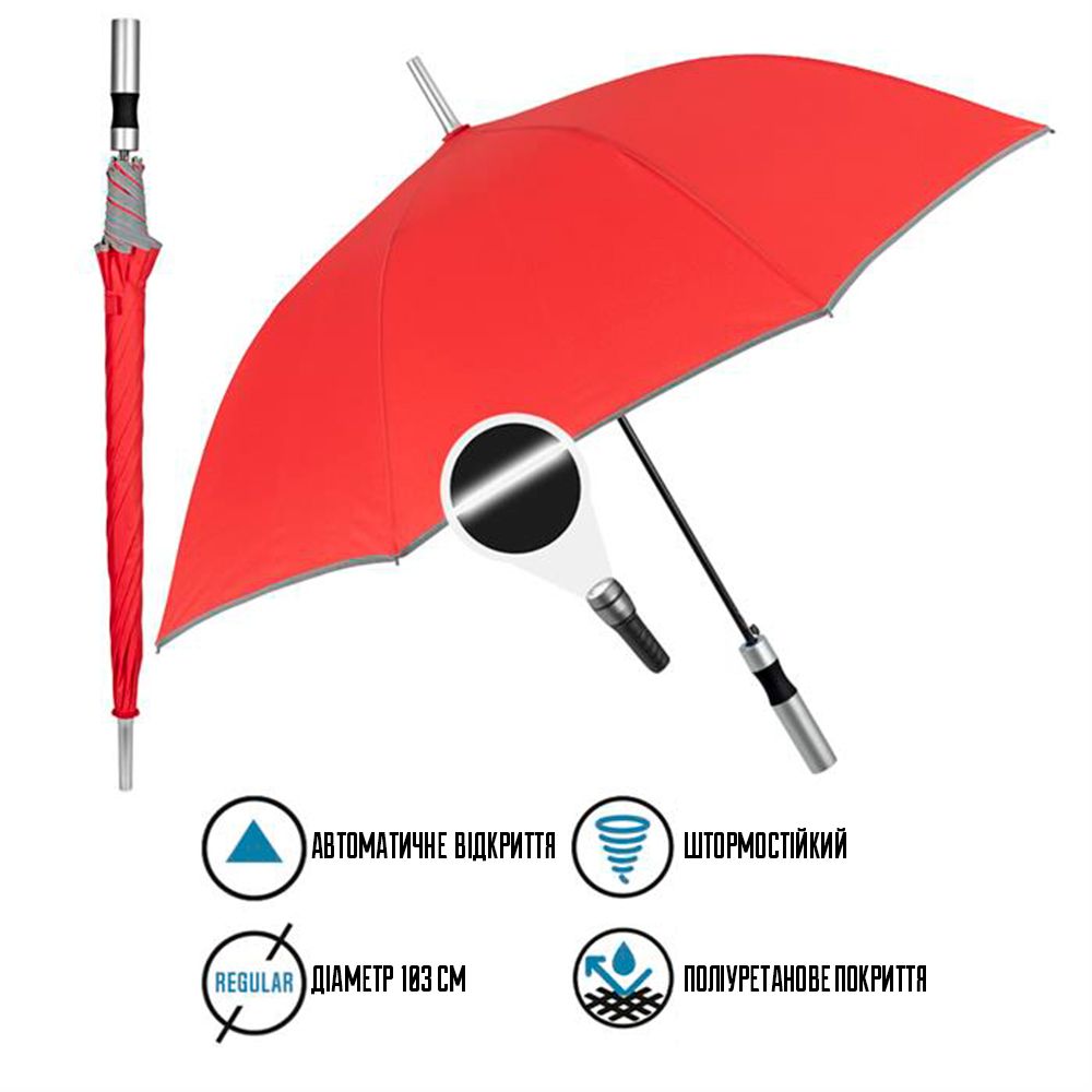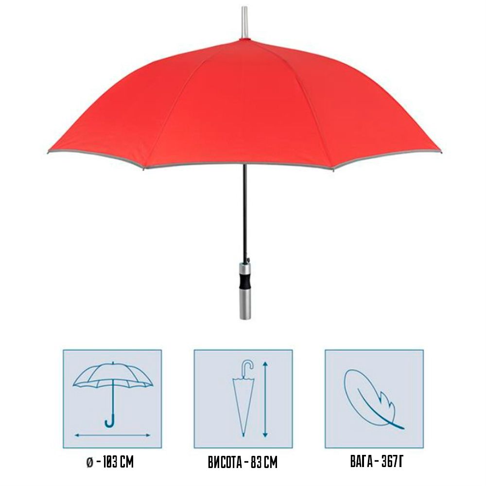 Особенность модели — светоотражающий кант по краю купола, повышающий безопасность в тёмное время суток. Зонт оснащён автоматическим открытием, что делает использование удобным даже одной рукой. Прямая пластиковая ручка матового серебристого цвета имеет эргономичную форму для комфортного держания.