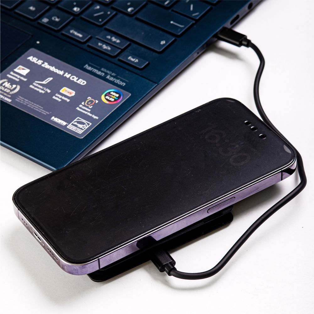Беспроводное зарядное устройство Flow с набором переходников USB/USB C – модель 3 в 1. Комплект адаптеров с кабелем упакован в контейнер, одна из панелей которого обеспечивает зарядку телефона и выполняет роль подставки (в раскрытом виде). Модель поддерживает функцию быстрой зарядки fast charge.