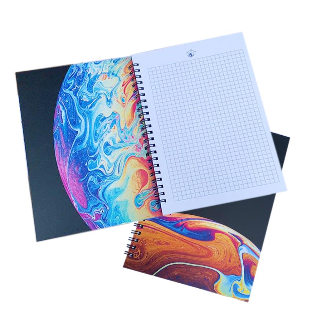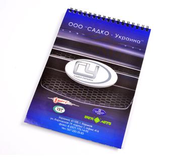 Цветная обложка на плотном картоне 350 г/м2, внутренний блок - бумага плотностью 80 г\м2. Листы внутреннего блока могут быть с нанесённой клеткой или линейкой и логотипом, печатаются одним цветом. Сборка на металическую пружину по короткой или длинной стороне. Блокнот имеет 48 листов. Формат А4, А5, А6.