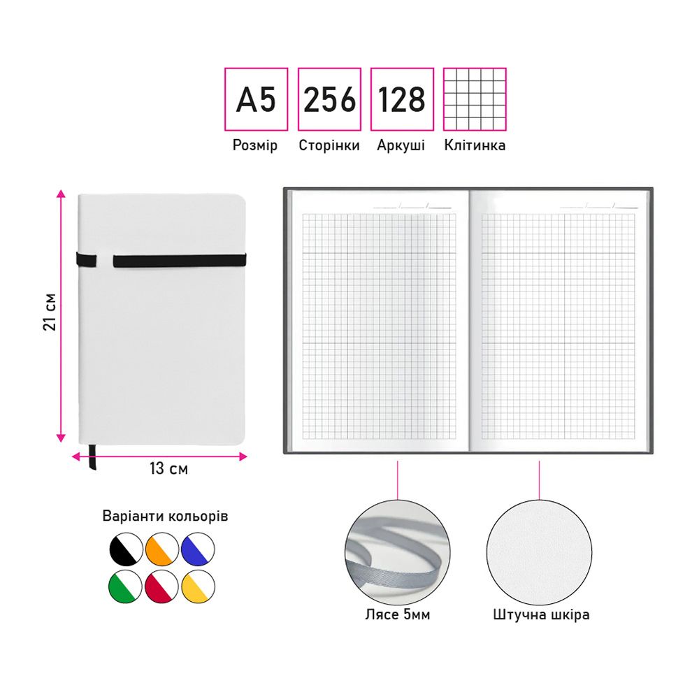 Гибкий блокнот Alanis формата A5 на 128 листов в клетку с мягкой белой обложкой из искусственной кожи выглядит презентабельно и приятен на ощупь. Скруглённые углы, горизонтальная цветная резинка-фиксатор и ляссе в тон создают гармоничный и практичный внешний вид. Цветной форзац, подобранный под оттенок фиксатора, добавляет стилю завершённости, а яркие акценты эффектно контрастируют с белыми страницами, делая блокнот современным и выразительным. В конце расположены 8 чистых перфорированных листов для удобного использования.