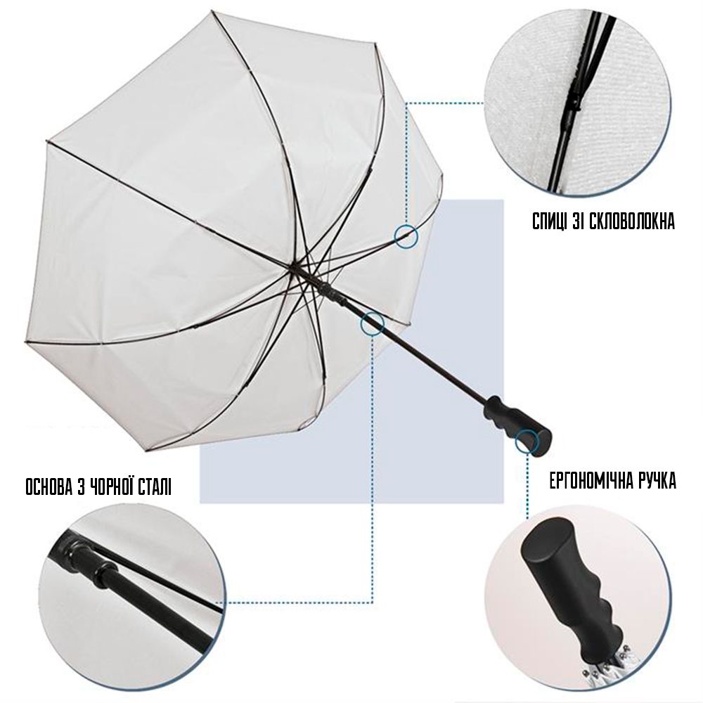 Конструкция оснащена прочным чёрным стержнем из стали и гибкими 8 спицами из стекловолокна, обеспечивающими устойчивость к сильному ветру. Купол из полиэстера Taslon отличается повышенной водонепроницаемостью, быстро сохнет и не содержит вредных PFC.