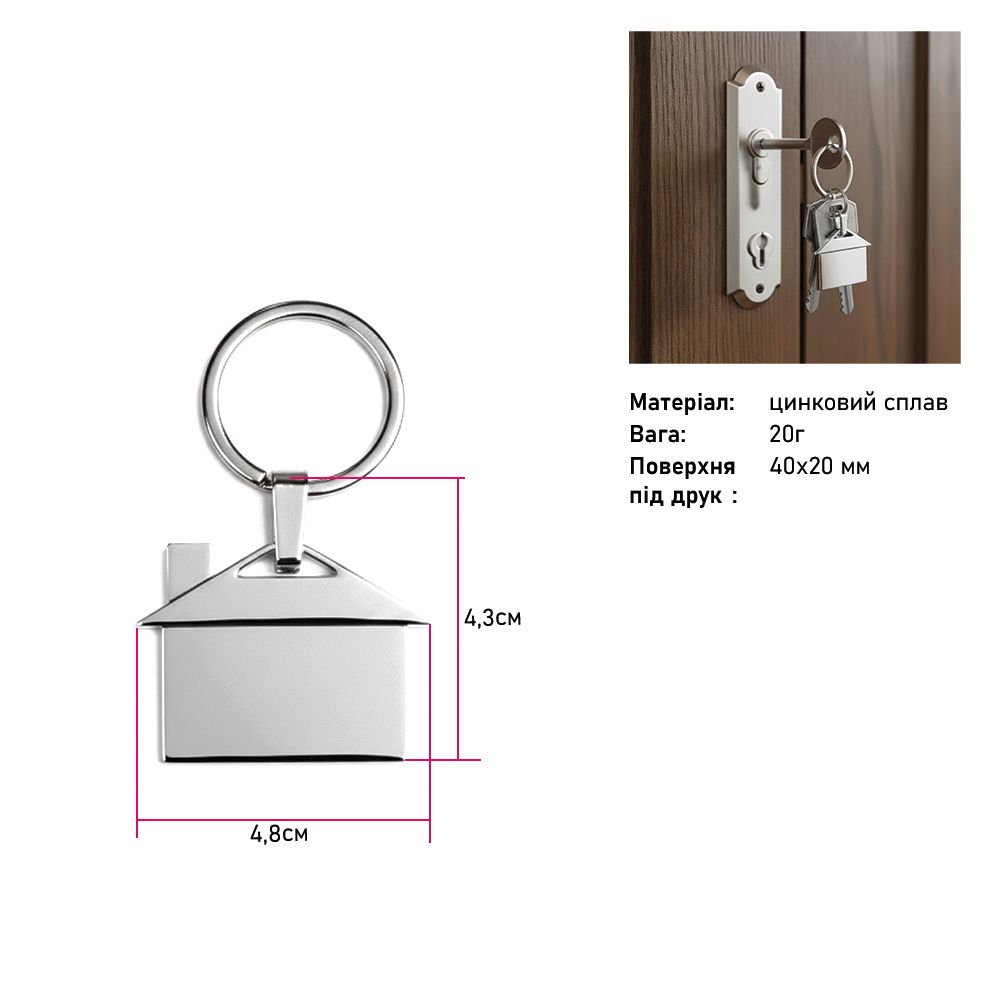Брелок в форме домика с металлической поверхностью обеспечивает идеальную площадь для нанесения логотипа компании, рекламного слогана или индивидуального дизайна. Благодаря этому он выполняет не только функцию удобного аксессуара, но и становится эффективным инструментом для продвижения бренда.