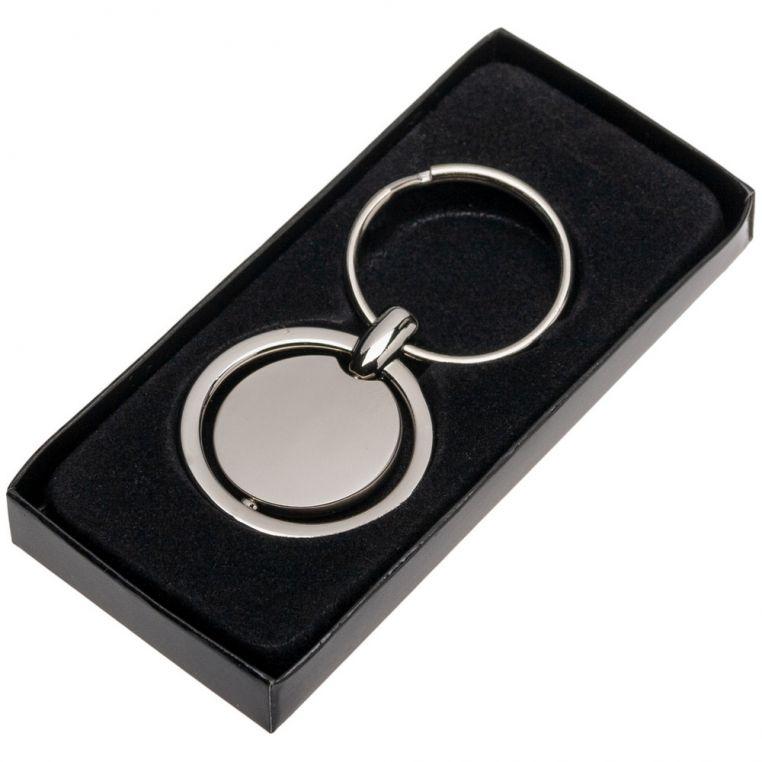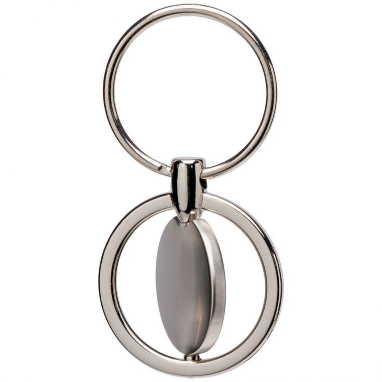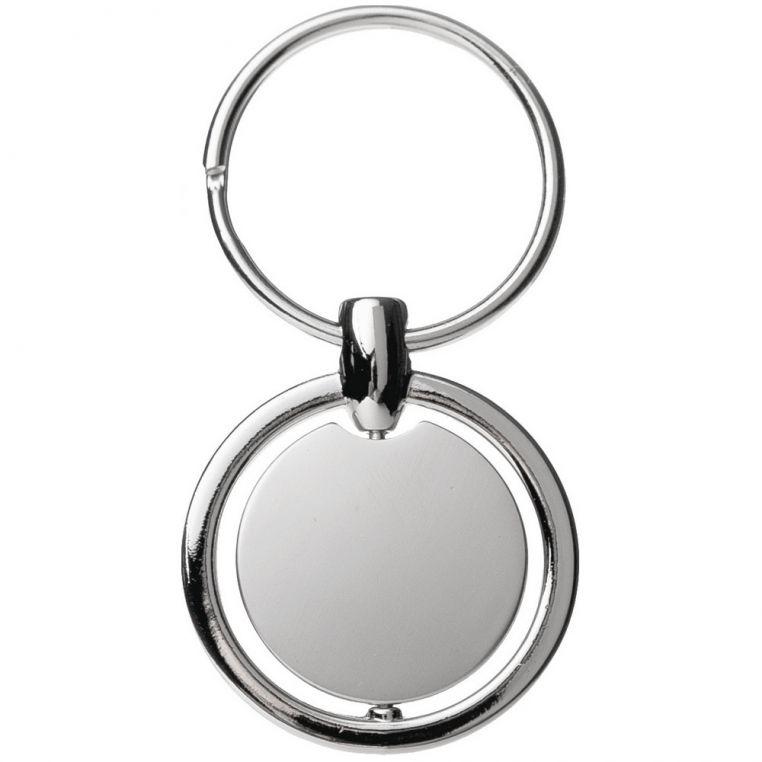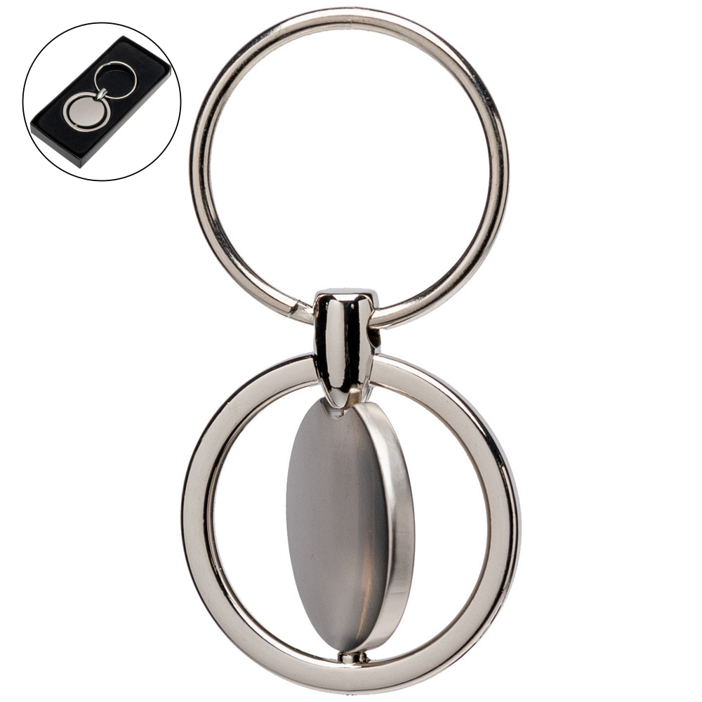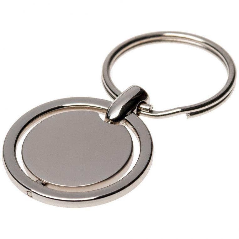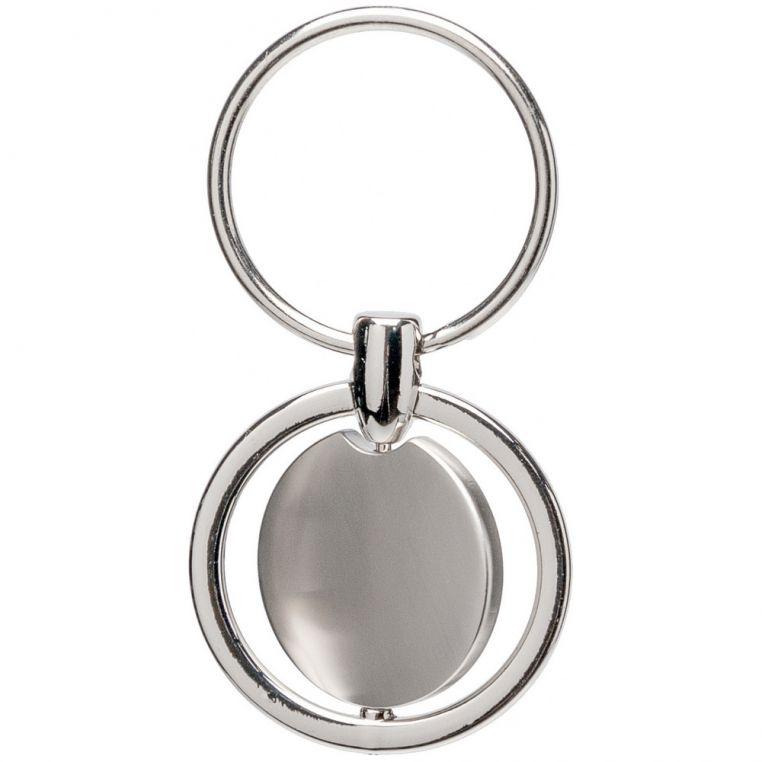 Металлический брелок круглой формы с вращающейся центральной частью. Оснащен кольцом для ключей.