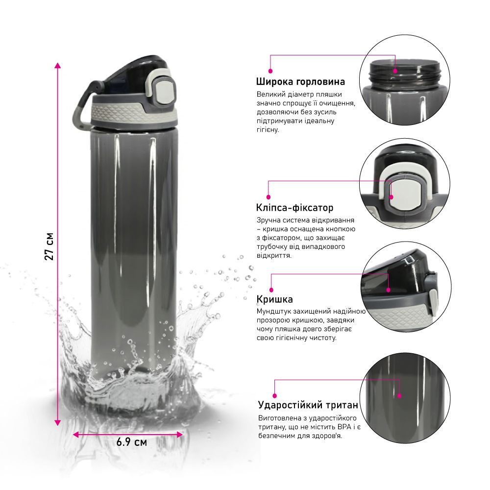 Универсальная тритановая бутылка для воды Rosario объемом 700 мл от бренда Line Art — практичное решение для повседневного использования, корпоративных подарков и промоакций. Крышка оснащена кнопкой с фиксатором, предотвращающим случайное открытие и обеспечивающим защиту внутренней трубочки. Пластиковый носик для питья с откидной защитной крышкой гарантирует гигиеничность и удобство использования в спортзале, офисе или на улице. TPR-вставки по бокам крышки обеспечивают надежное удержание и комфортное открывание даже мокрыми руками. Благодаря широкому горлышку бутылку легко мыть и быстро наполнять. Изготовлена из ударопрочного тритана (BPA-free), не впитывает запахи и подходит для различных напитков.