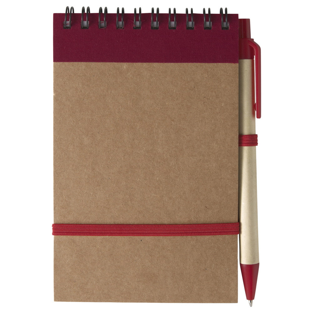 Эко-блокнот формата А6 с ручкой. Блокнот из переработанного картона на горизонтальной пружине. Обложка и ручка фиксируются с помощью резинок.