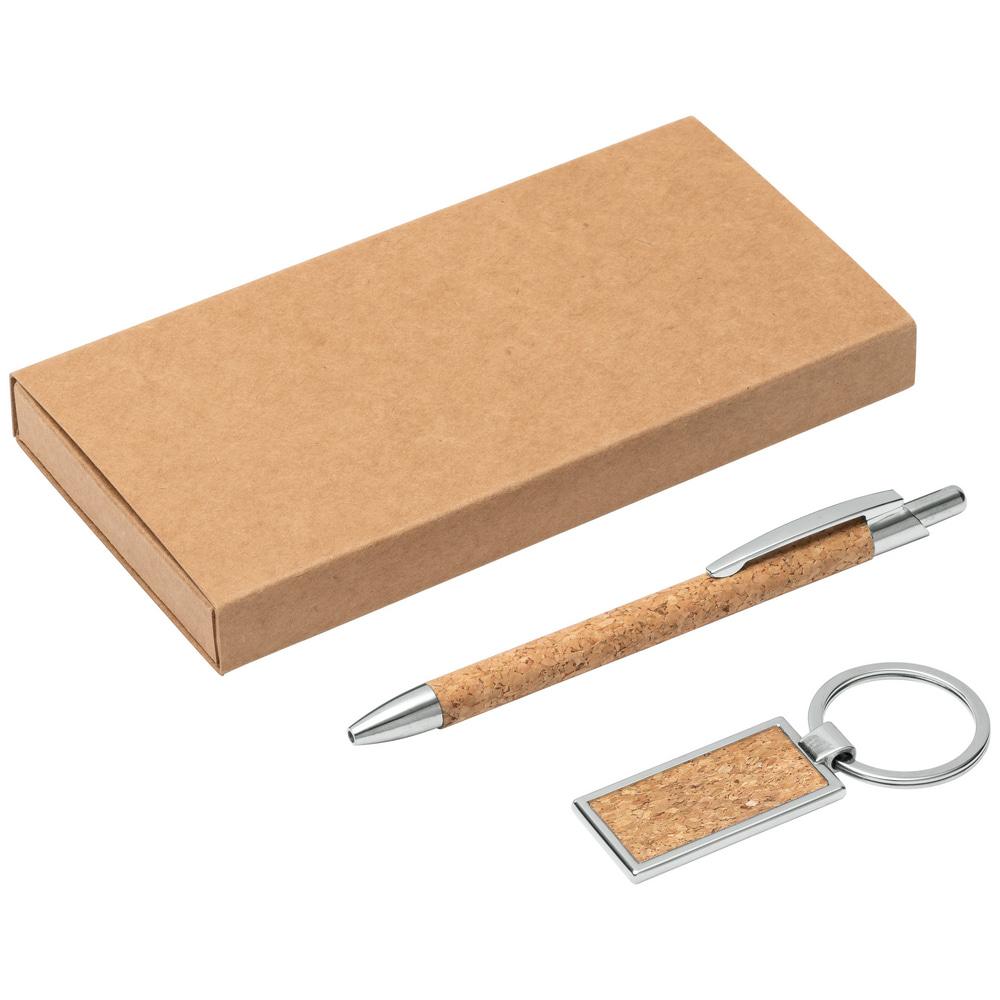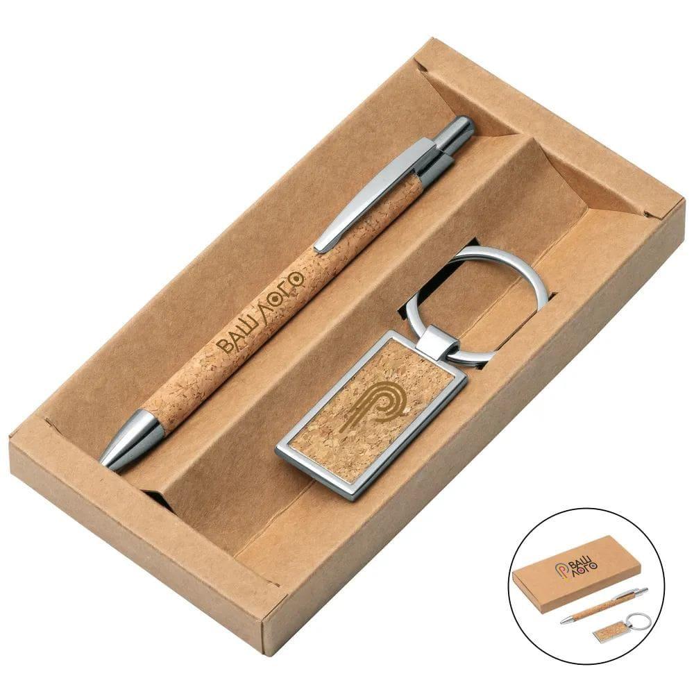 Подарочный набор шариковой ручки и брелока из металла с корковым покрытием под нанесение логотипа. Идет в подарочной упаковке из крафт-бумага. На коробке также можно сделать тематическую надпись.