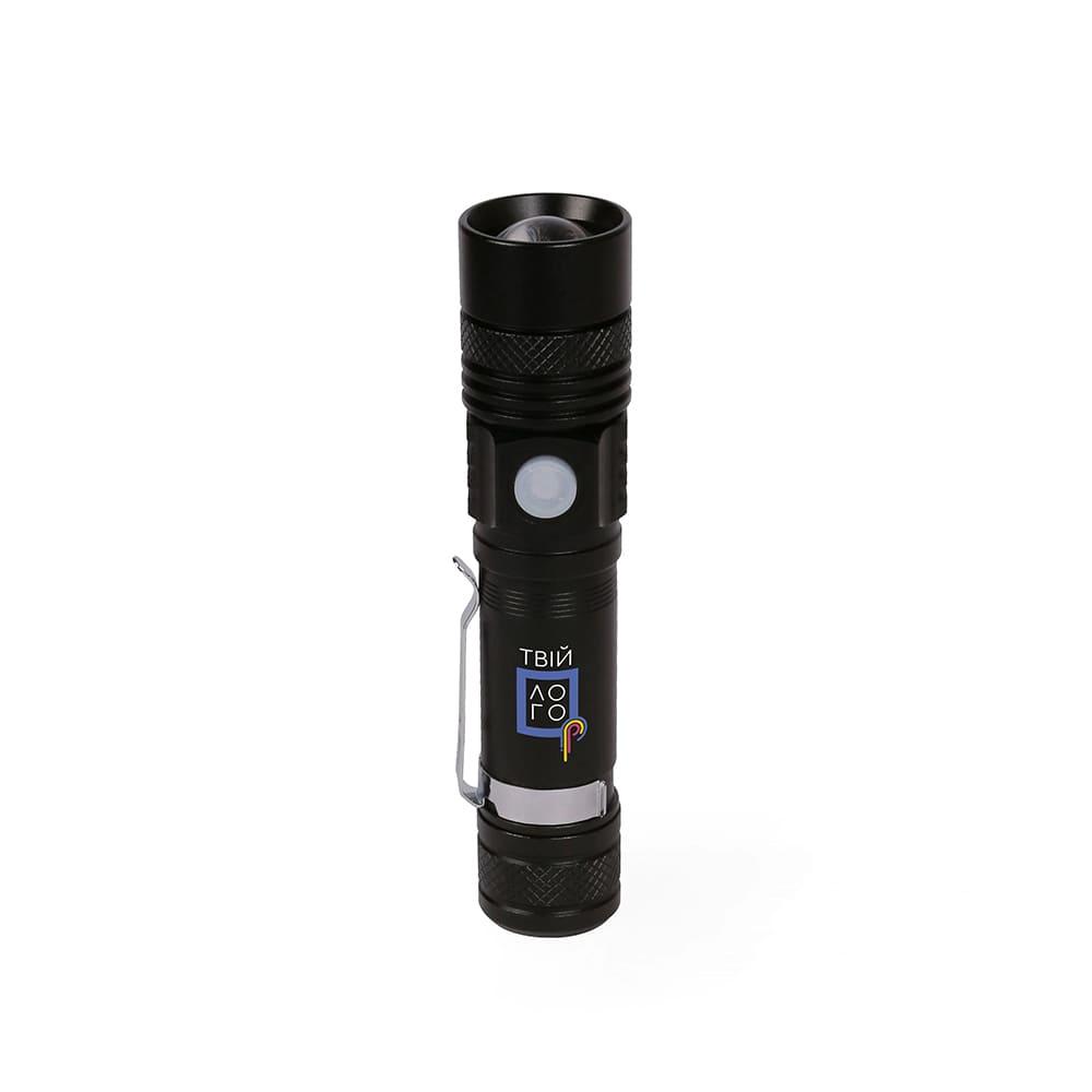 Черный фонарик Focus, TM Discover с зарядкой от USB с логотипом