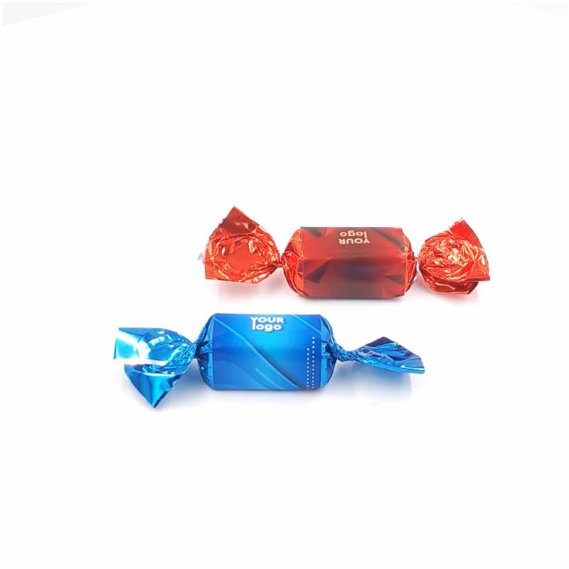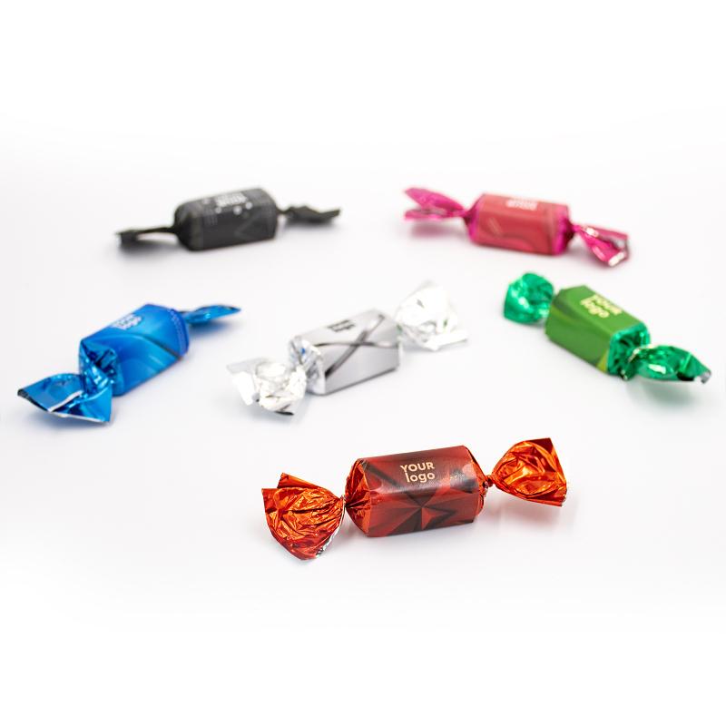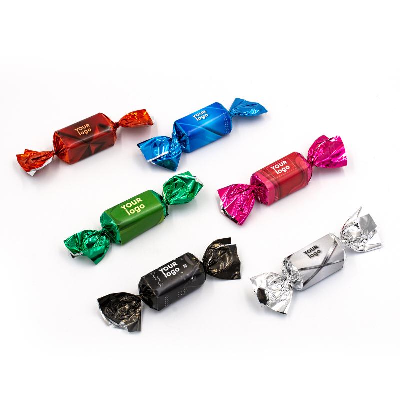 Конфета "Мармелад в шоколаде" с логотипом, 16 г — вкусная желейная конфета в аппетитной шоколадной глазури, завернута в яркую твист-плёнку. В ассортименте — несколько цветов обёртки: красный, зелёный, золотой, розовый, синий, чёрный, серебро, что позволяет подобрать вариант под стиль бренда или мероприятия. Идеально подходит для промоакций, выставок или подарочных наборов.