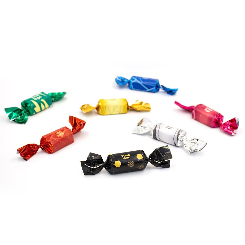 - Упаковка: яркая твист-плёнка (золотая, серебряная, розовая, чёрная, красная, синяя или зелёная) с полноцветным логотипом на самоклеящейся бумаге