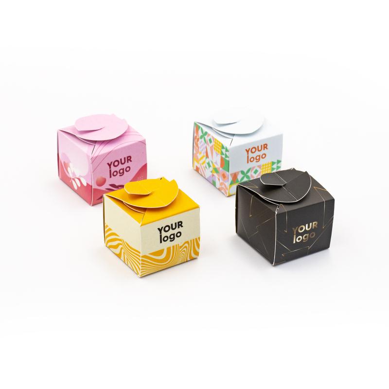 Упаковка изготовлена из плотного картона (230 г/м²), размером 35×35×30 мм, с полноцветной печатью и ламинацией — матовой или глянцевой на выбор.