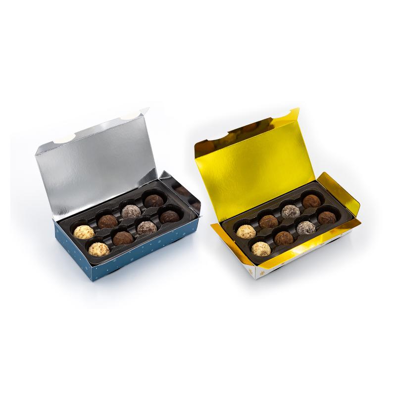 Премиальная коробка с французскими трюфелями в шоколаде — идеальный подарок или корпоративный сувенир. Оформление доступно в трёх вариантах: односторонняя печать, двусторонняя печать или премиум с тиснением золотом/серебром. Полноцветная печать на прочном картоне 230 г с матовой или глянцевой ламинацией придаёт упаковке стильный вид. Изысканный вкус и презентабельный дизайн сочетаются в формате 170 × 92 × 27 мм, создавая впечатление продукта премиум-класса. Тип упаковки: книга.