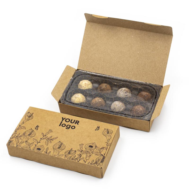 Коробка конфет "Трюфель" весом 100 г в упаковке типа "Книга" предлагает стильный и персонализированный подарок для клиентов и партнеров. Внутри находится высококачественный немецкий шоколад, представленный в форме трюфелей. Дизайн упаковки, выполненной из плотного крафт-картона (230 г) с нанесением полноцветной печати, можно адаптировать под ваш логотип, что делает продукт особенно подходящим для брендирования.