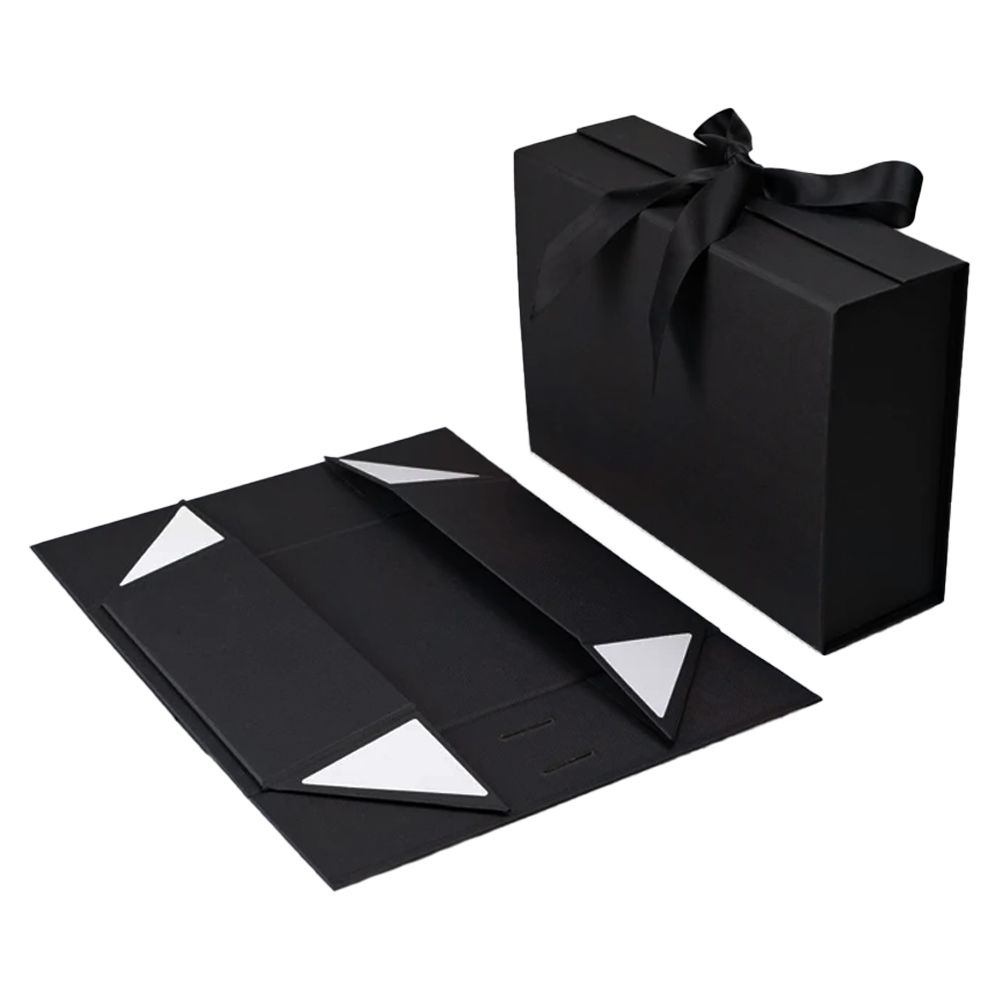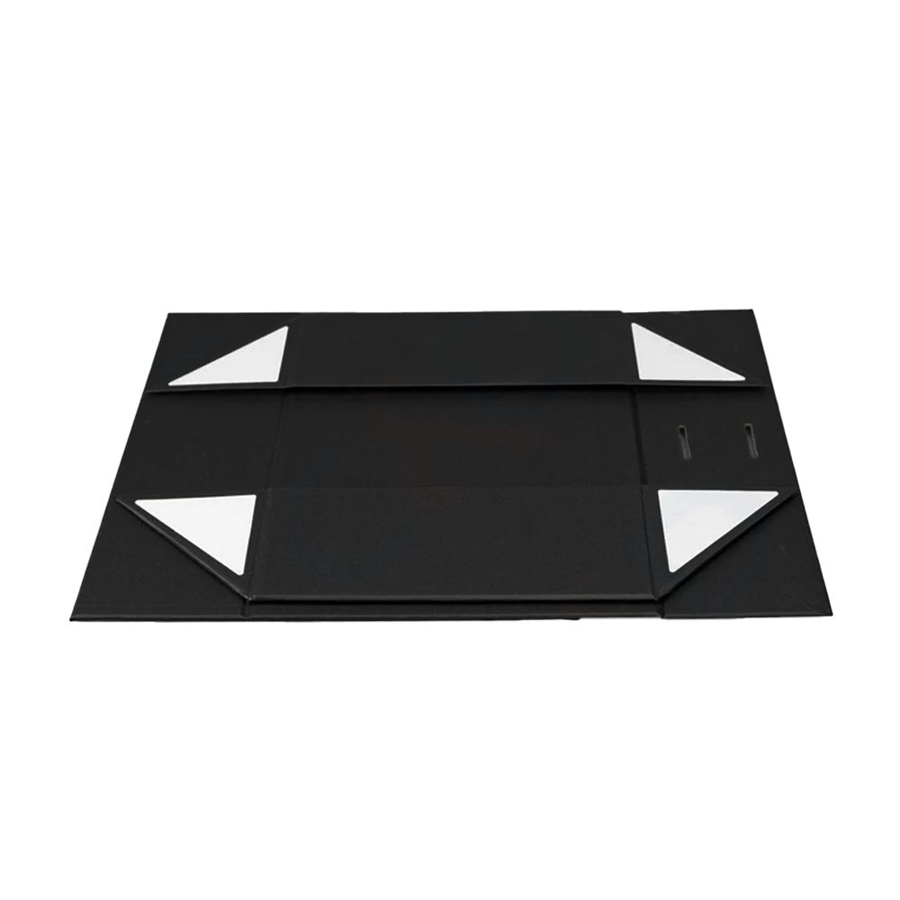 Изготовлена из прочного картона плотностью 1200 г/м², покрытого крафт-бумагой с лаковым покрытием для дополнительной защиты. Имеет складную конструкцию (Collapsible Gift Box) и надёжное магнитное закрывание, которое подчёркивает премиальный стиль упаковки.