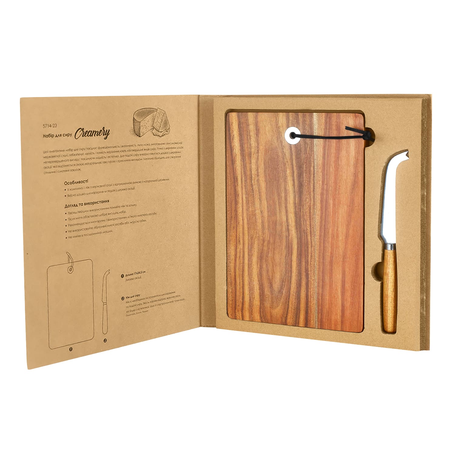 Натуральная деревянная доска подчёркивает экологичность изделия, а нож из нержавеющей стали обеспечивает удобство в использовании и длительный срок службы. Универсальный нож подходит для нарезки как мягких, так и твёрдых сыров, а эргономичная ручка гарантирует комфорт во время работы.