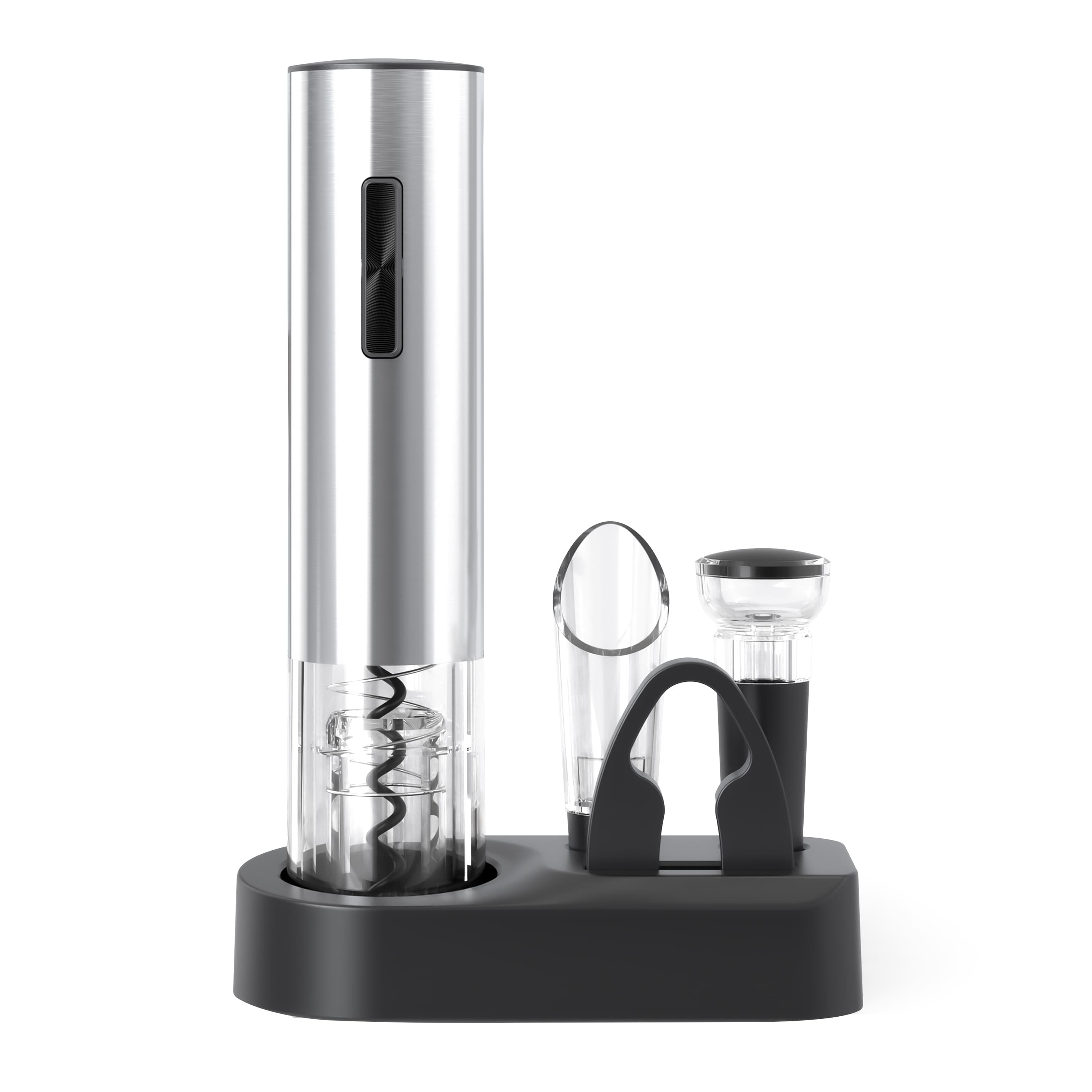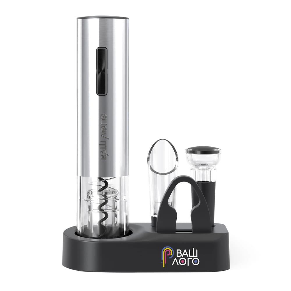 Набор для вина с электрическим штопором Merlot — практичный и удобный аксессуар для быстрого и аккуратного открытия бутылок вина. С электрическим штопором процесс занимает всего несколько секунд, что делает его идеальным для ресторанов, отелей, кейтеринговых компаний и корпоративных подарков. В комплект входят электрический штопор, наливник, вакуумная пробка, нож для фольги и подставка для хранения. Набор оснащен встроенным никель-металлгидридным аккумулятором 500 мАч с зарядкой через Type-C, изготовлен из металла и пластика. Размер изделия составляет 13,7 × 20 × 6,8 см, вес — 390 г. Элегантный дизайн и индивидуальная упаковка делают Merlot стильным и премиальным решением для корпоративных подарочных наборов и гастрономических мероприятий, а возможность нанесения логотипа компании превращает его в эффективный инструмент продвижения и брендинга.