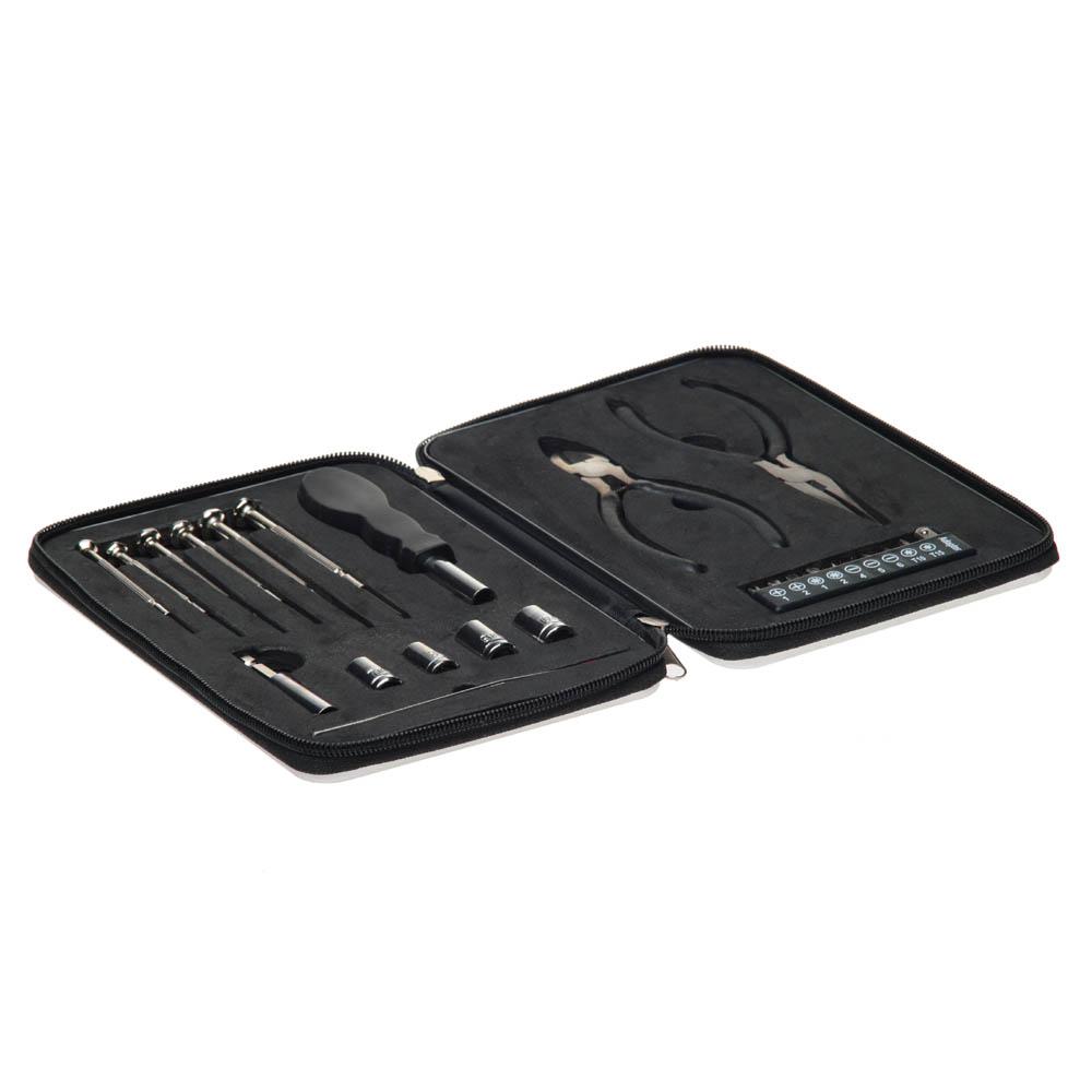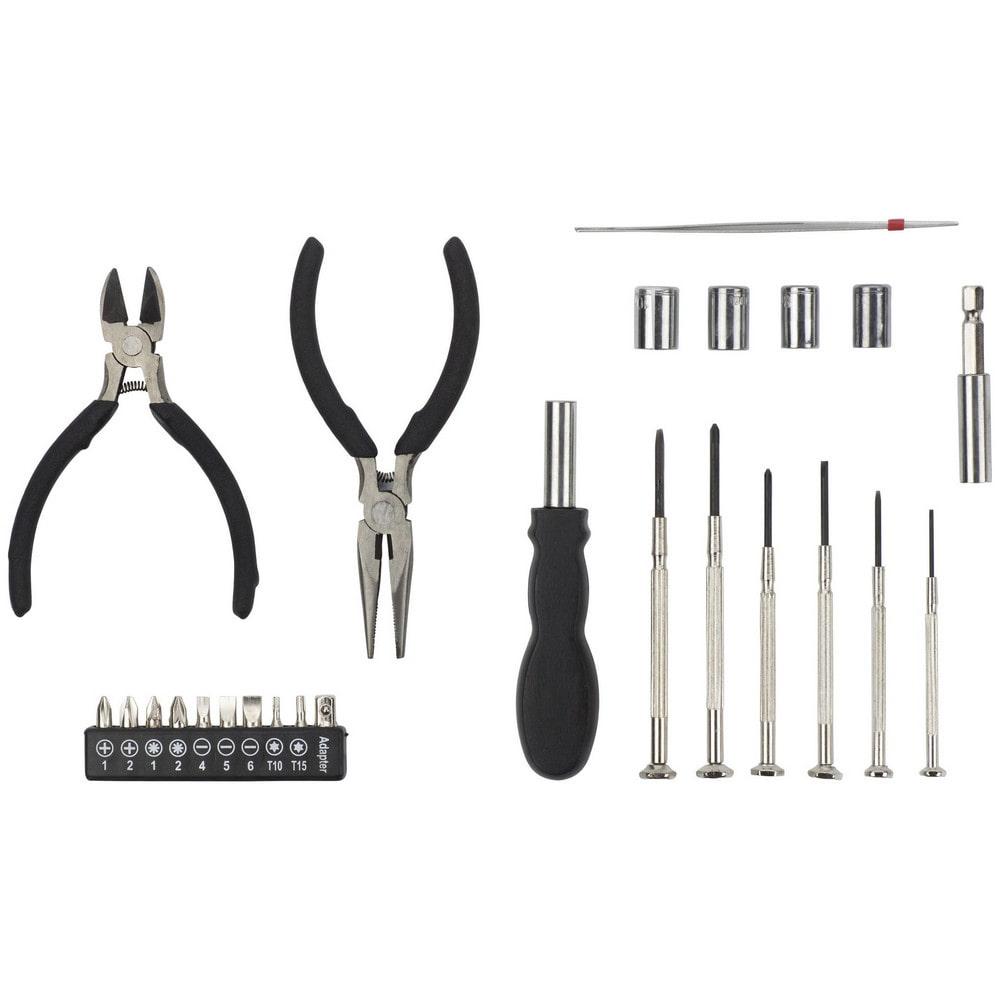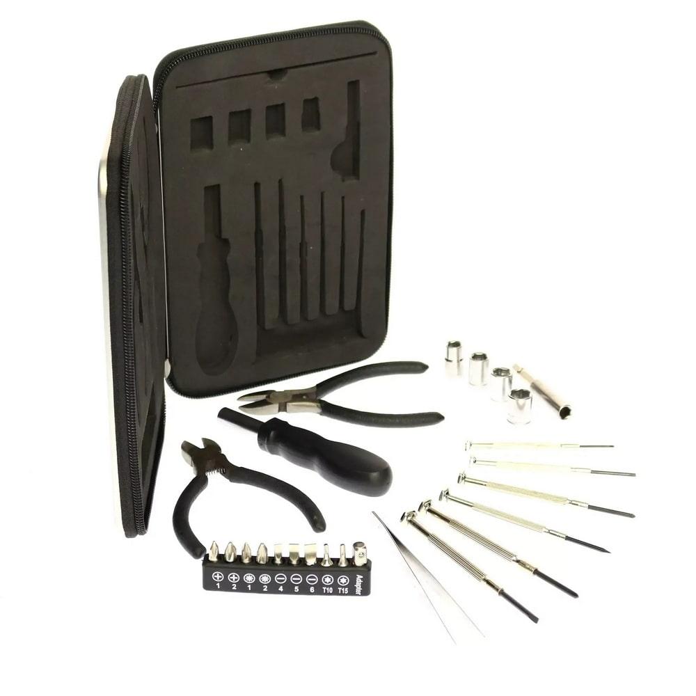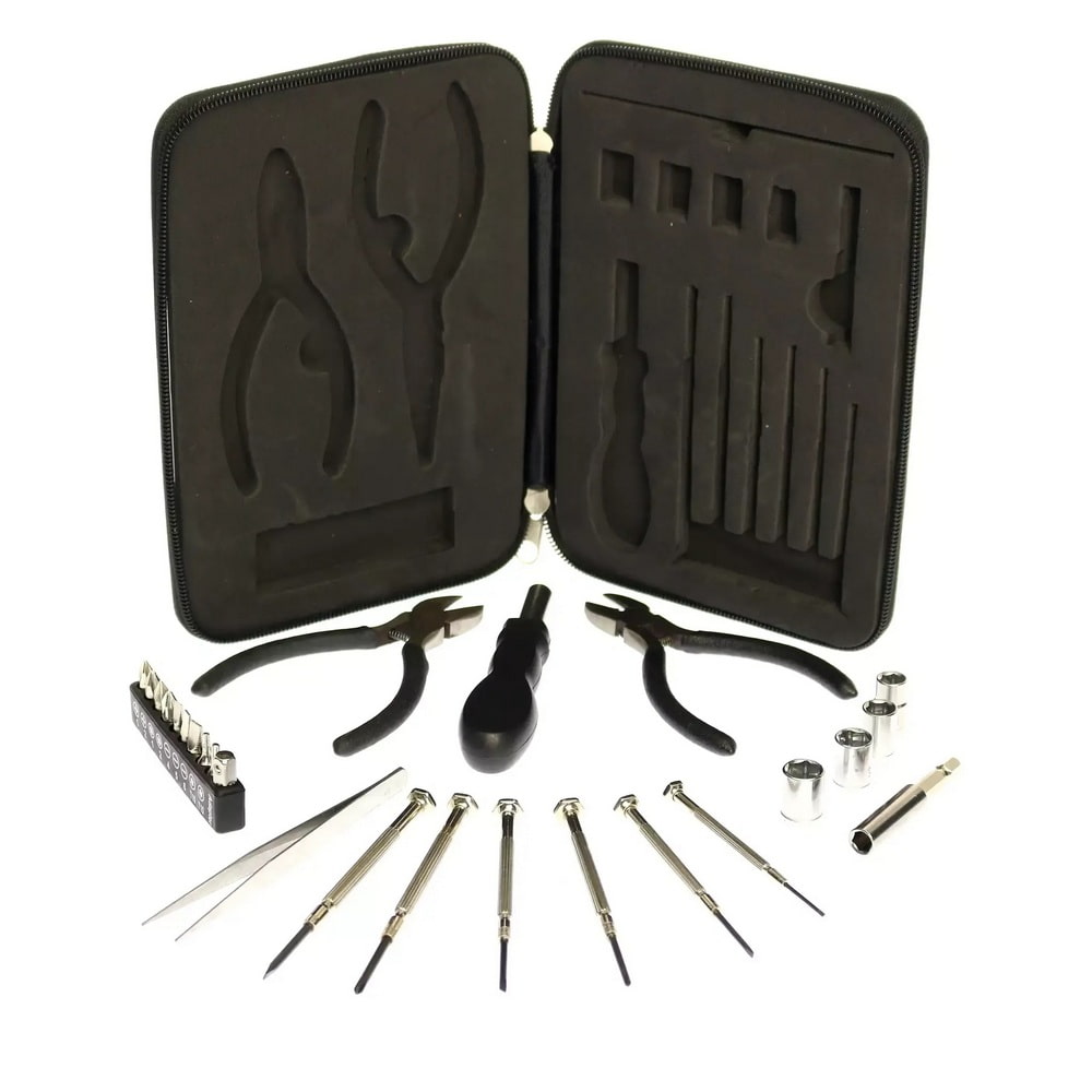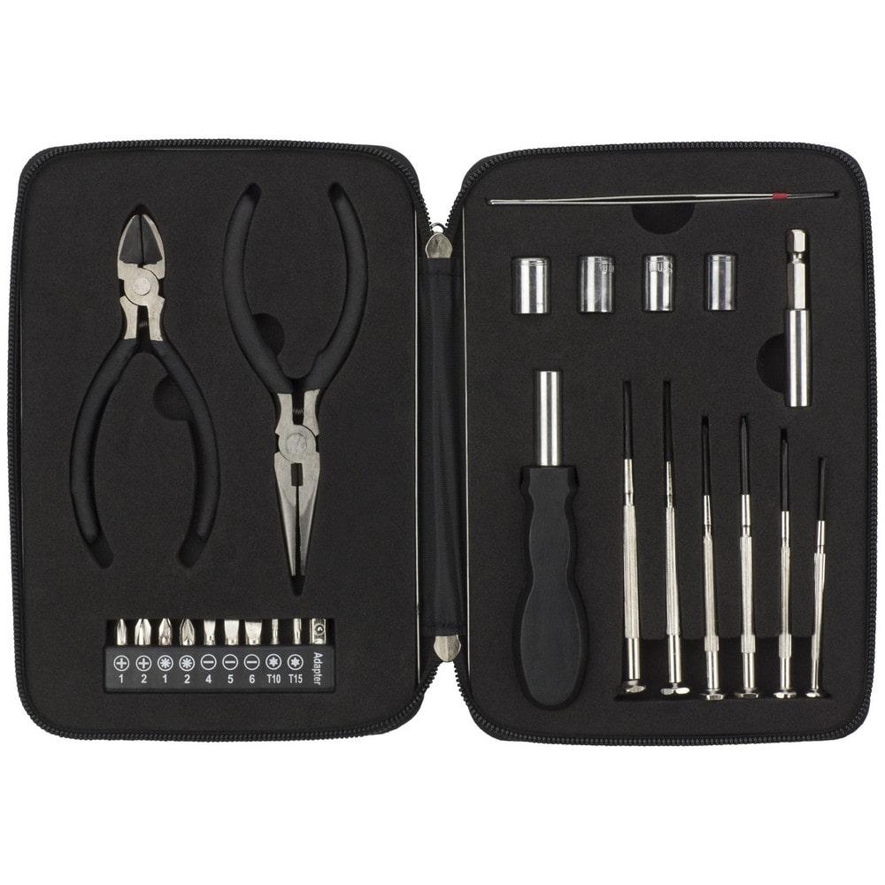 Удобный набор инструментов из 26 предметов из алюминия и стали. Набор включает: два плоскогубца, держатель с девятью разными насадками, переходник, пинцет, четыре насадки, переходник, ручку и шесть различных прецизионных инструментов.