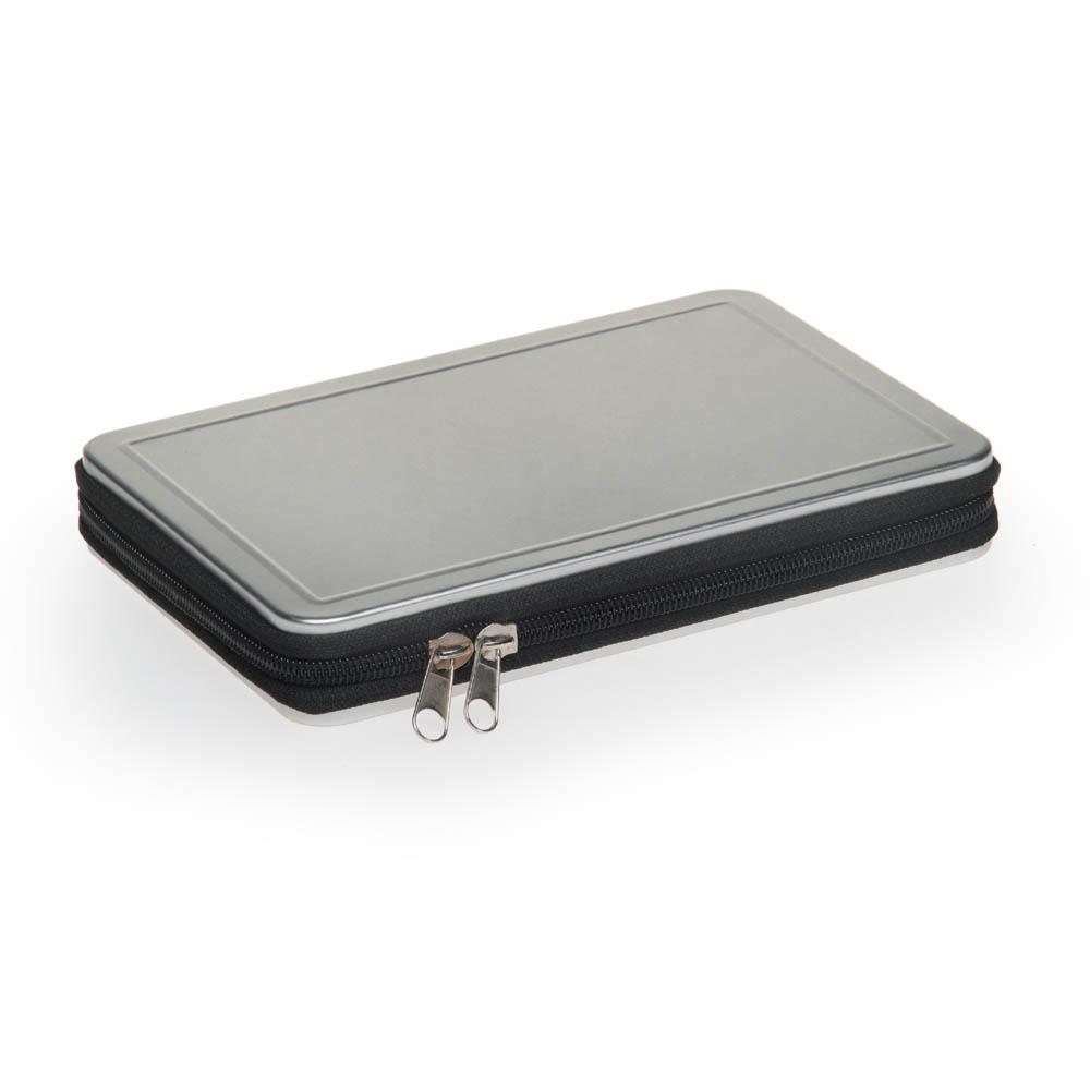 Запакован в металлический кейс с застежкой-молнией и вкладышем из пены EVA.