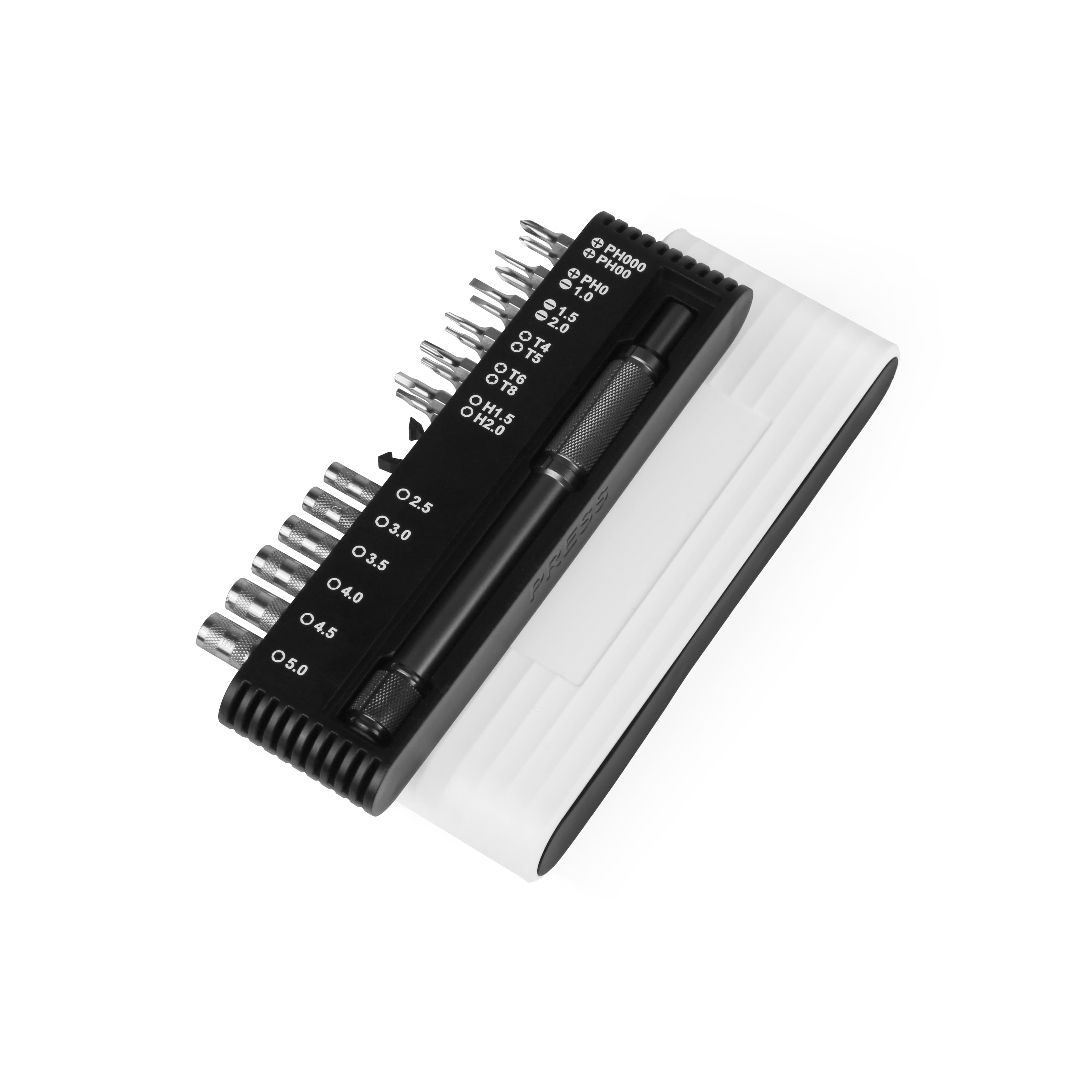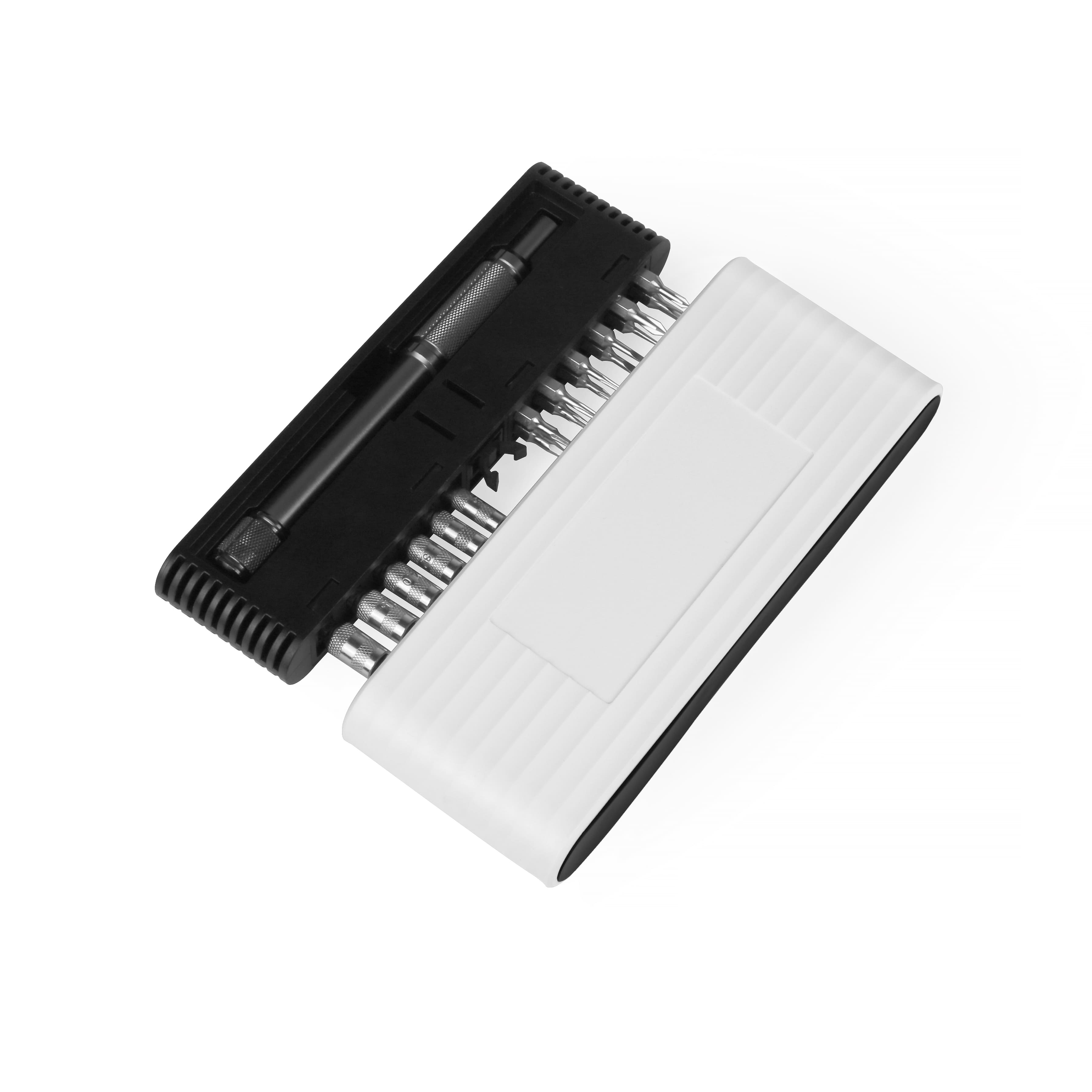 Мини набор из высококачественной стали в компактной, пластиковой коробке. В комплект входит 19 штук инструментов: 1шт отвертка 12 шт. Бит (4x28 мм): 1.0,1.5,2.0,PH000,PH00,PH0,T4,T5,T6,T8,H1.5,H2.0 6 бит для гаек: 2,5 мм, 3,0 мм, 3, 5 мм, 4,0 мм, 4,5 мм, 5,0 мм. Размер набора 135Х52Х22 мм. Нанесение тампопечати, уф-печать, объемная смоляная наклейка.