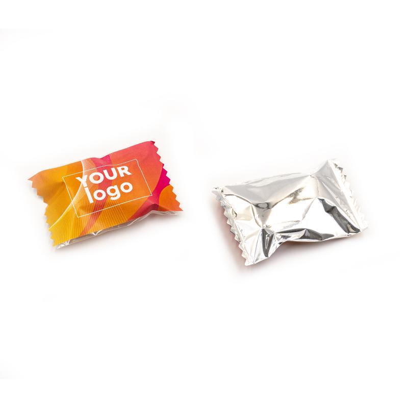 Печенье "Сantuccini" с логотипом (4,5 г) – это брендированная закуска с вариантами вкусов: клюква с шоколадом, ореховый микс, миндаль, клюква, шоколад с фундуком. Печенье упаковано в полипропиленовую плёнку с возможностью выбора прозрачной, металлической или жемчужной упаковки, на которой размещают логотип. Размер упаковки составляет 66 x 45 мм, а срок годности – 9 месяцев.