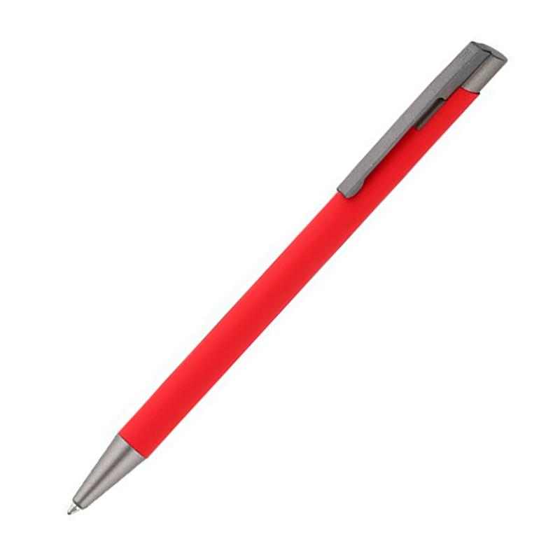 Корпус ручки выполнен из алюминия, сверху качественное покрытие Soft touch. Изделие оснащено кнопкой и наконечником серого цвета.