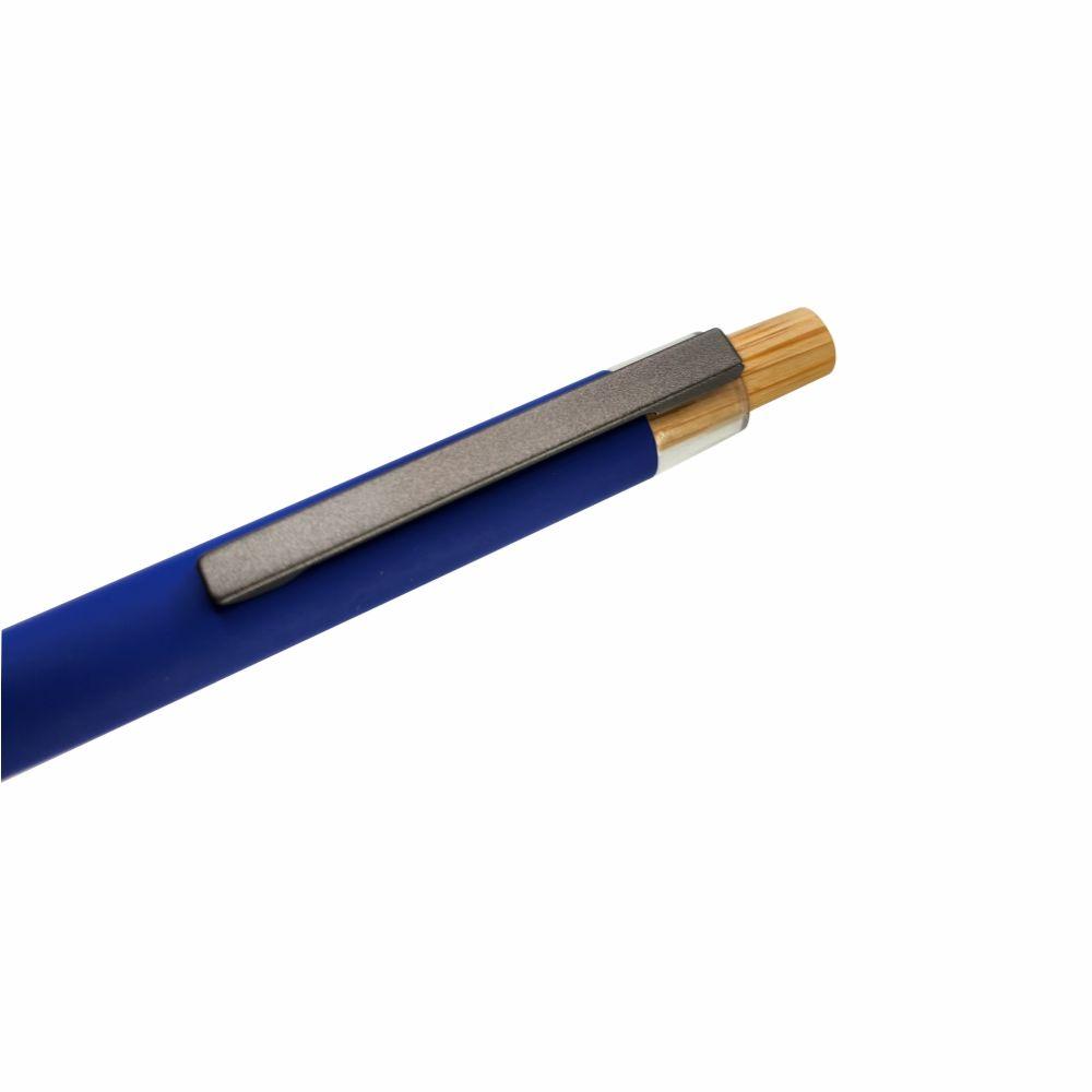 Корпус ручки выполнен из алюминия и имеет резиновое покрытие Soft touch. Регулируется кнопкой из бамбука. Кнопка находится в гнезде из прозрачного пластика. Окончание ручки украшено серебристым кольцом, которое соединяет части изделия.