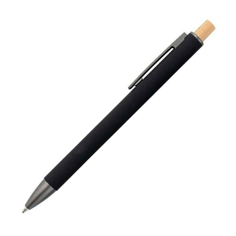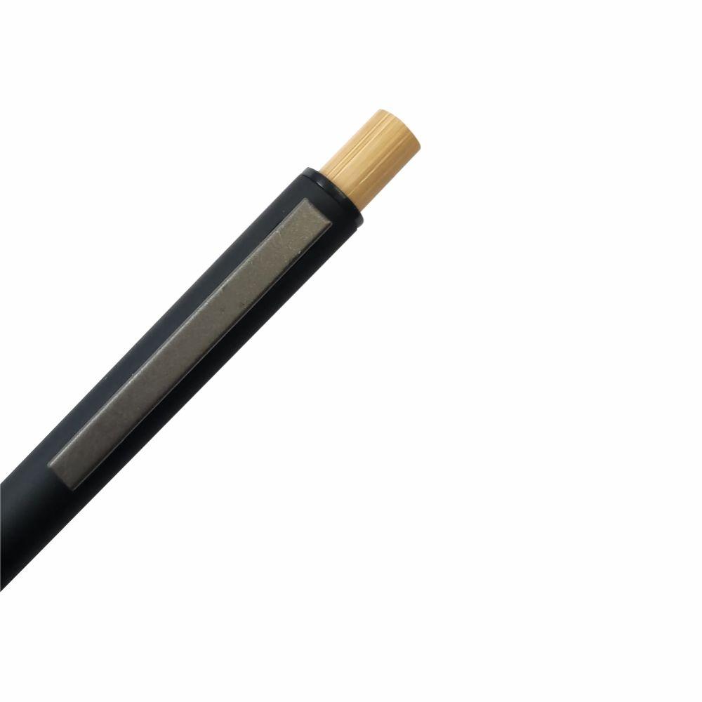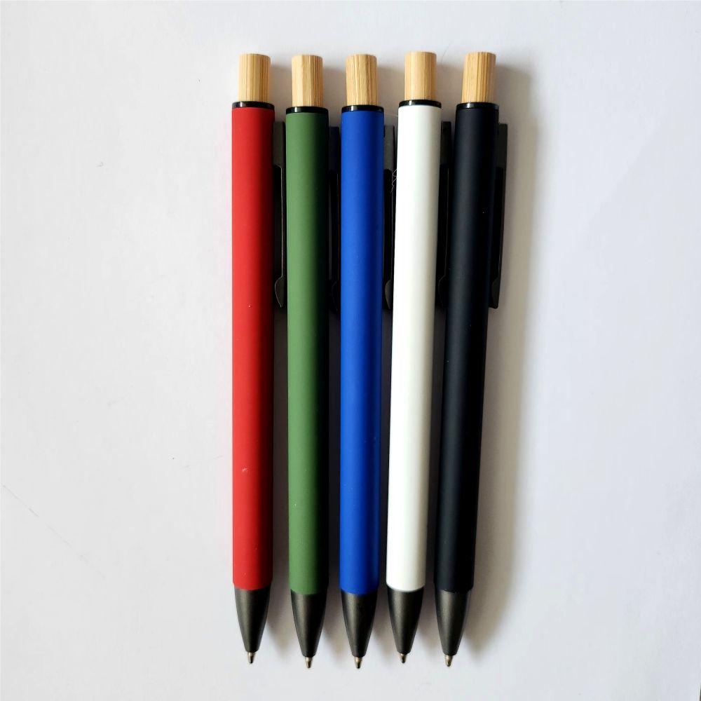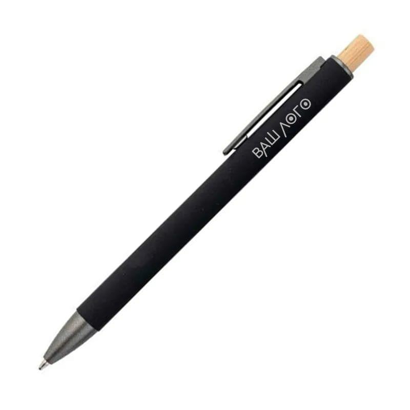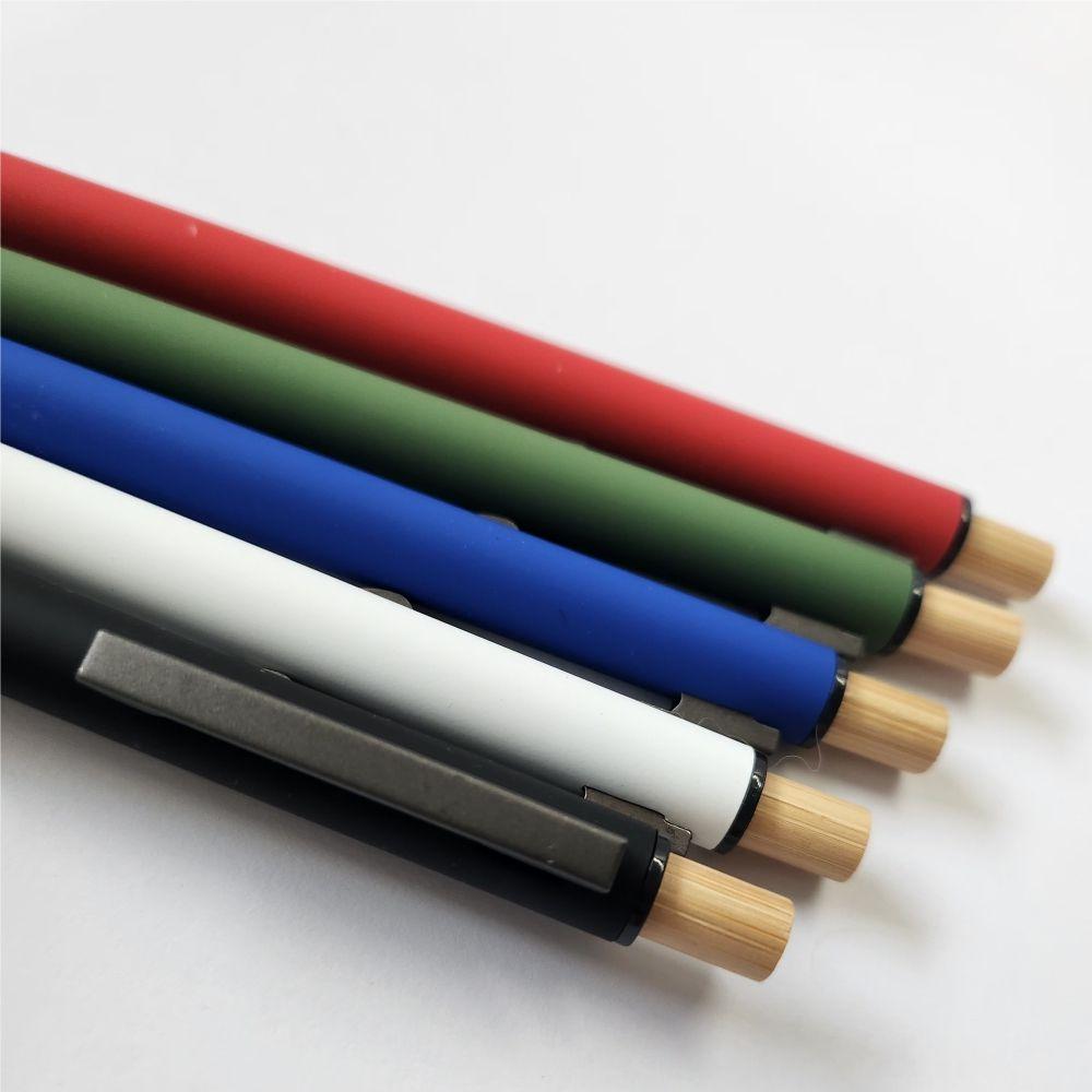 Корпус ручки изготовлен из алюминия, сверху нанесено цветное покрытие Soft touch. Изделие имеет бамбуковую кнопку.
