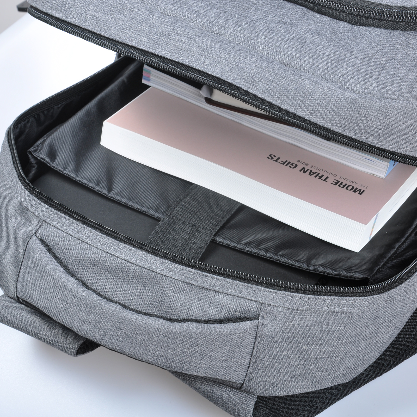 Имеет одно большое отделение, с фиксатором для ноутбука, 1 фронтальный карман на молнии и 2 боковых. Мягкая спинка, лямки с пассивной системой вентиляции. Уплотненная мягкая подкладка. Размер синей вставки: горизонталь – низ 24 см, верх 22 см, вертикаль: 14,4 см.
