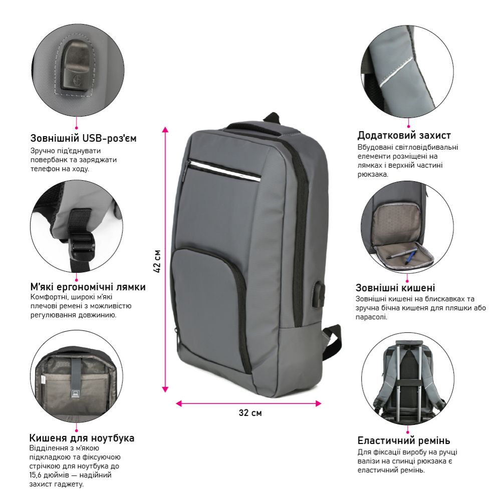 Рюкзак имеет продуманную конструкцию: одно основное отделение на молнии с мягким отсеком для ноутбука и внутренними карманами для кошелька, телефона и других мелочей. Внешние карманы на молниях и удобный боковой карман для бутылки или зонта. Встроенные светоотражающие элементы размещены на лямках и верхней части рюкзака для лучшей видимости в темное время суток.
