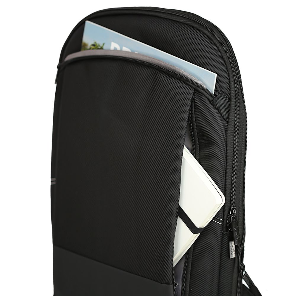 Модель оснащена основным отделением с органайзером, передним карманом с несколькими молниями и дополнительным карманом на спинке. По периметру вшита молния, позволяющая увеличить или уменьшить объем. На одной из лямок есть карман для карт.