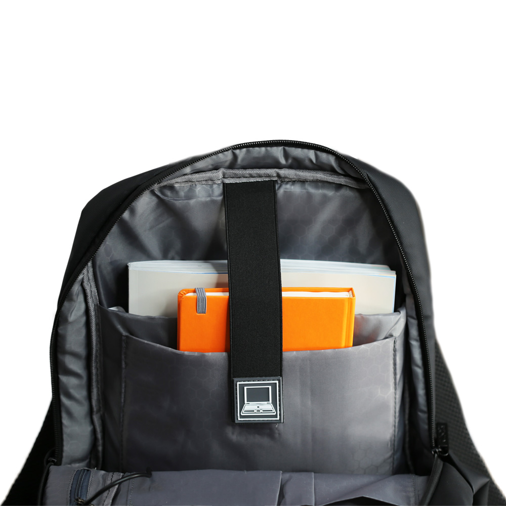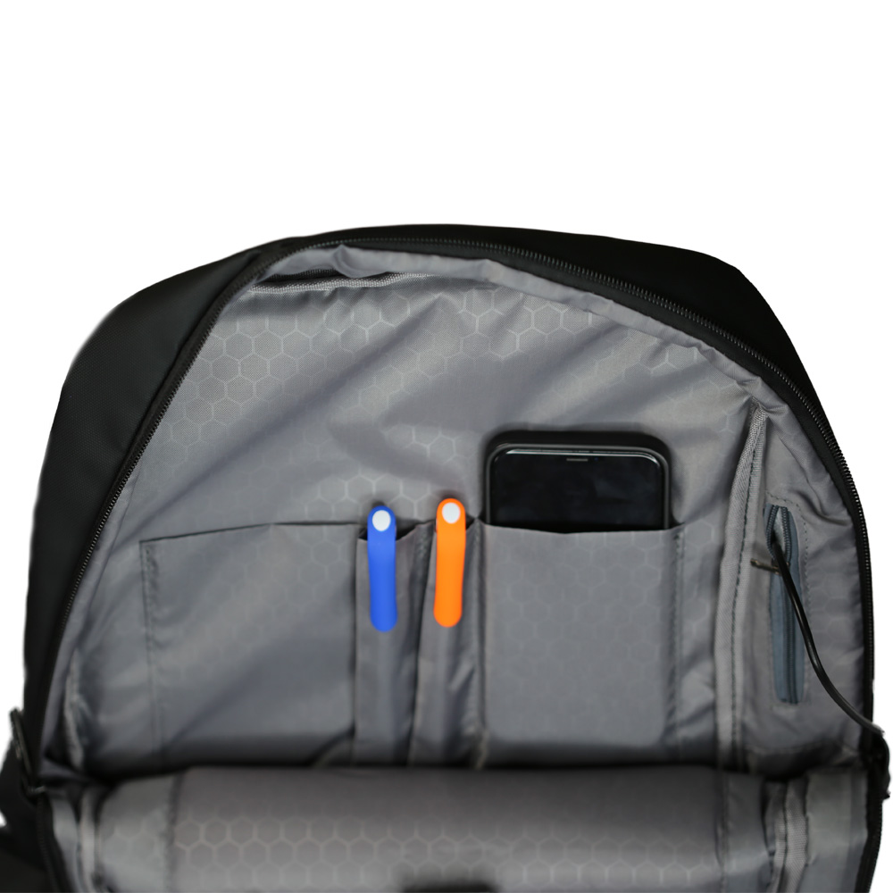 Дорожный рюкзак имеет продуманную конструкцию и отличную внутреннюю организацию. Основное отделение на молнии достаточно просторное: внутри предусмотрены большие мягкие карманы для ноутбука и планшета. Есть дополнительные карманы для смартфона, документов, книг, а также специальные отсеки для карточек, очков и ручек. На передней части рюкзака расположены два внешних кармана на молнии для быстрого доступа к самым необходимым вещам: один вверху, второй — по центру, с планкой, скрывающей молнию.