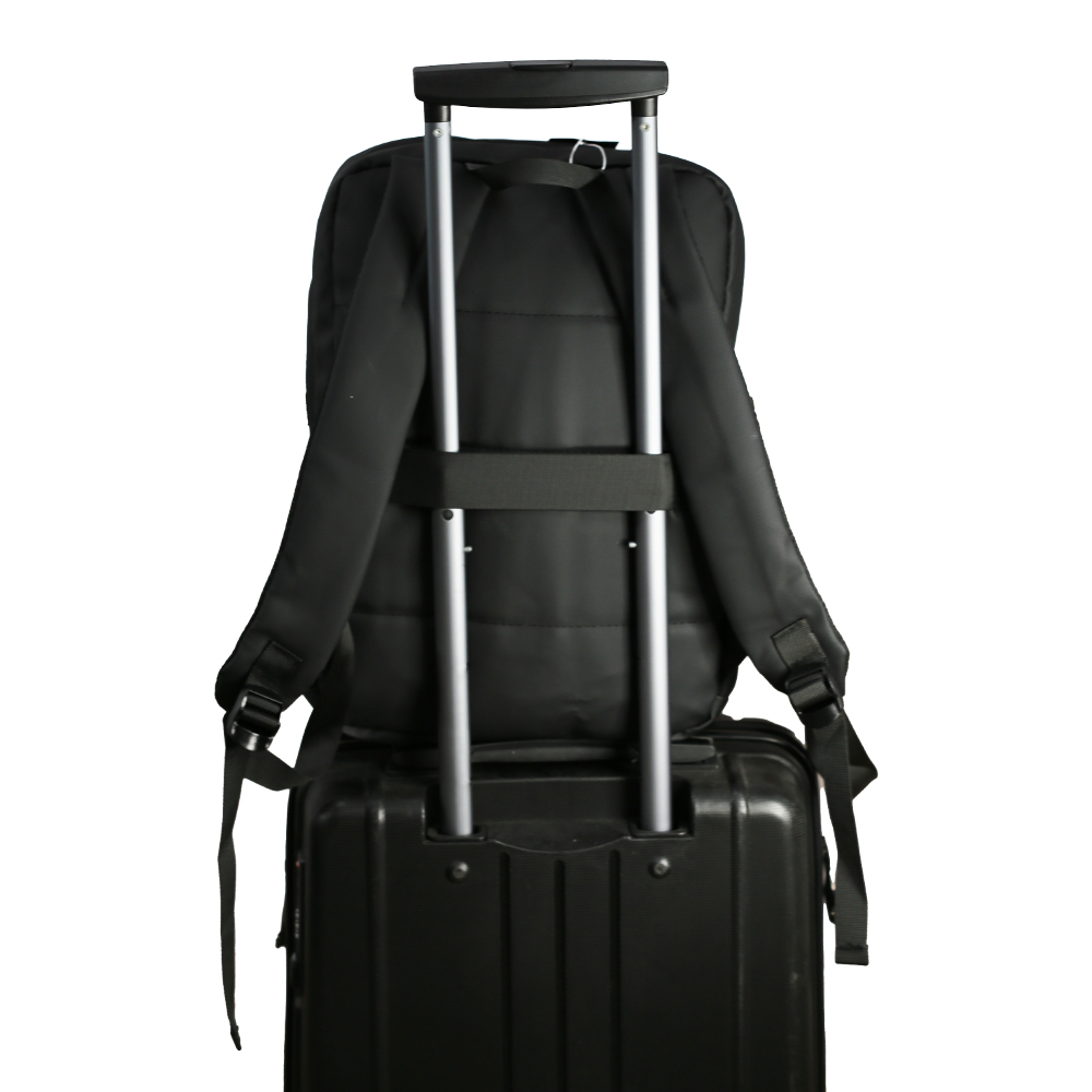 - Эластичный ремень на спинке для крепления рюкзака к ручке чемодана.