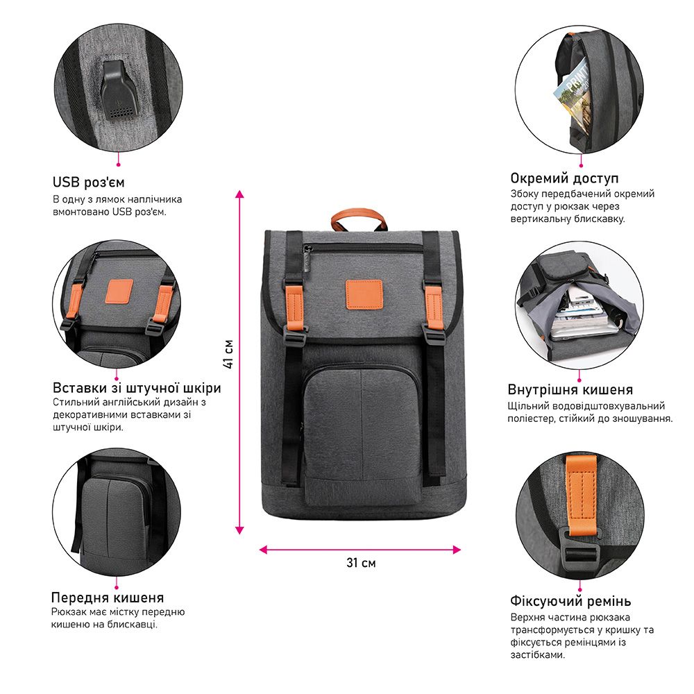 Рюкзак имеет продуманную конструкцию: большое отделение с мягким карманом для ноутбука до 15", дополнительные внутренние карманы для мелких вещей и аксессуаров, а также вместительный передний карман на молнии. Верхняя панель рюкзака откидывается вниз и фиксируется ремнями с застёжками. На ней расположено дополнительное отделение на молнии, а сбоку предусмотрен отдельный доступ в рюкзак через вертикальную молнию.