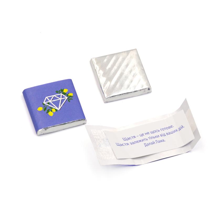 Размер: 32 × 32 × 6 мм, вес — 5 г. Дополнительно возможно вложение предсказания внутрь — приятный сюрприз для получателя.