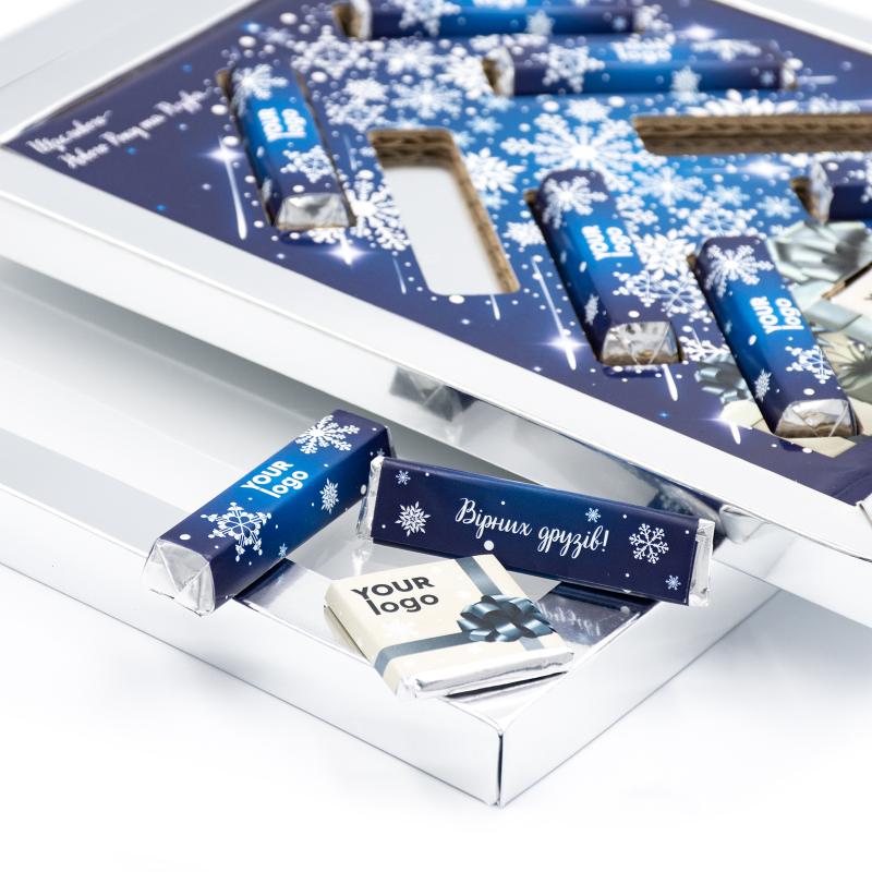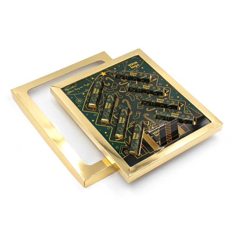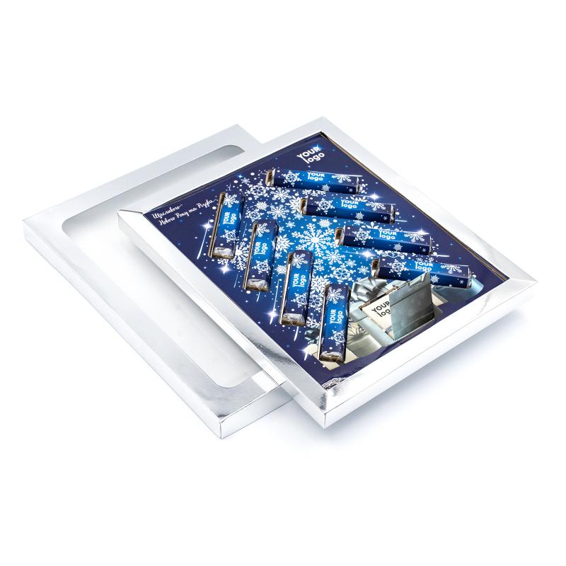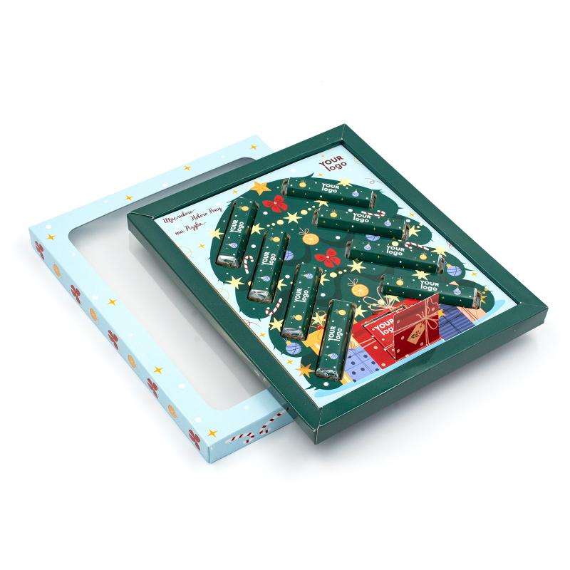 Шоколадный набор "Ёлочка" с логотипом компании, 80 г — это изысканный подарок, сочетающий вкус настоящего шоколада и стильную презентацию. В наборе — молочный (33%) и тёмный (60%) шоколад в формате плиток (4 г) и батончиков (9,5 г). Упакован в элегантную коробку типа «крышка-дно с окошком», изготовленную из плотного картона (230 г) с полноцветной печатью, возможностью премиального оформления золотом или серебром, а также с матовой или глянцевой ламинацией. Цвет фольги для шоколада — золотой или серебряный. Идеальное решение для корпоративных подарков в праздничный сезон. Размер коробки — 227 × 191 × 17 мм.