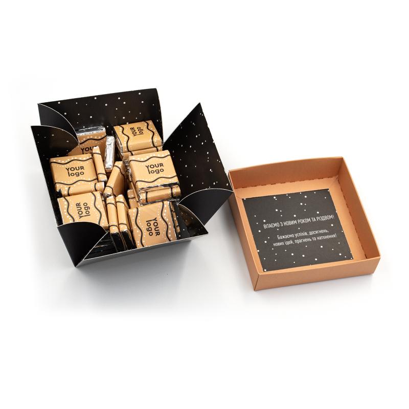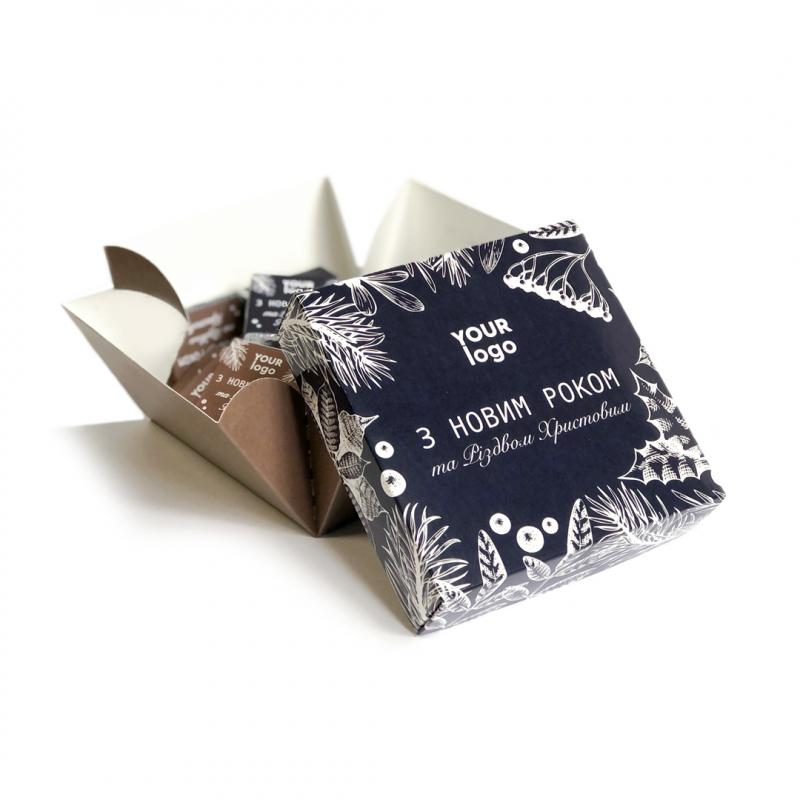 Шоколадный набор "Куб" 150 г с индивидуальным логотипом — это стильный подарок с изысканным наполнением на выбор: чёрный шоколад 60%, молочный 33% или микс. Упакован в качественную картонную коробку (плотность 230 г/м²) с цветной печатью и ламинацией (матовой или глянцевой). Размер коробки — 90×94×62 мм. Этикетка — мелованная бумага 90 г/м². Цвет фольги для конфет — золотой или серебряный. Дополнительные услуги: двухсторонняя печать 4+4, тиснение фольгой (золото/серебро), внутреннее ламинирование золотом или серебром. Идеально подходит в качестве корпоративного сувенира.