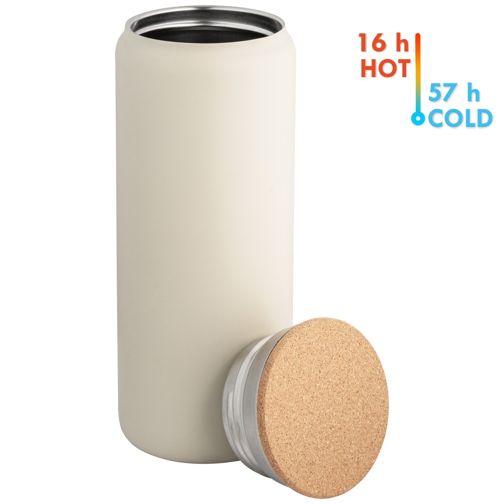 Термос с двойными стенками из нержавеющей стали с вакуумной изоляцией. На крышке имеется пробковая вставка. Диаметр крышки: 73 мм. Внутренняя стенка с медным покрытием. Сохраняет напитки горячими в течение 16 часов и холодными в течение 57 часов.