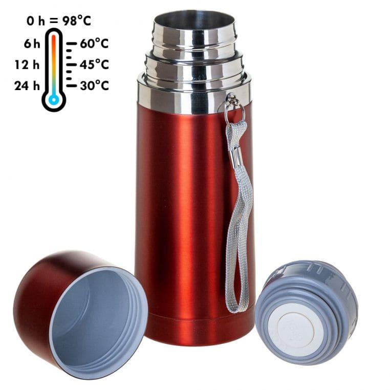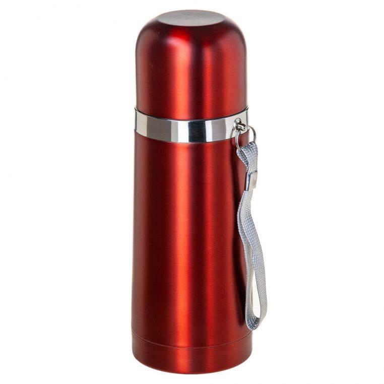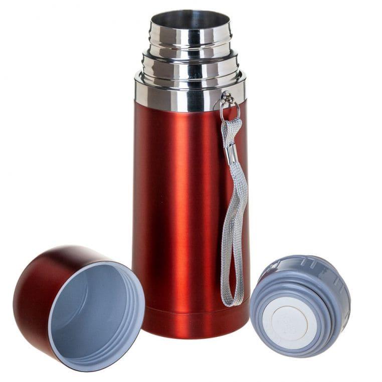 Корпус термоса из нержавеющей стали с двойной стенкой. Крышку можно использовать в качестве чашки. На корпусе есть ремешок на руку.