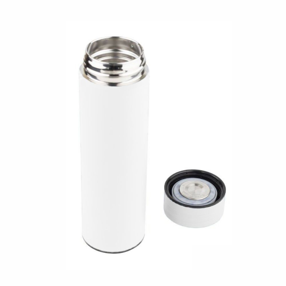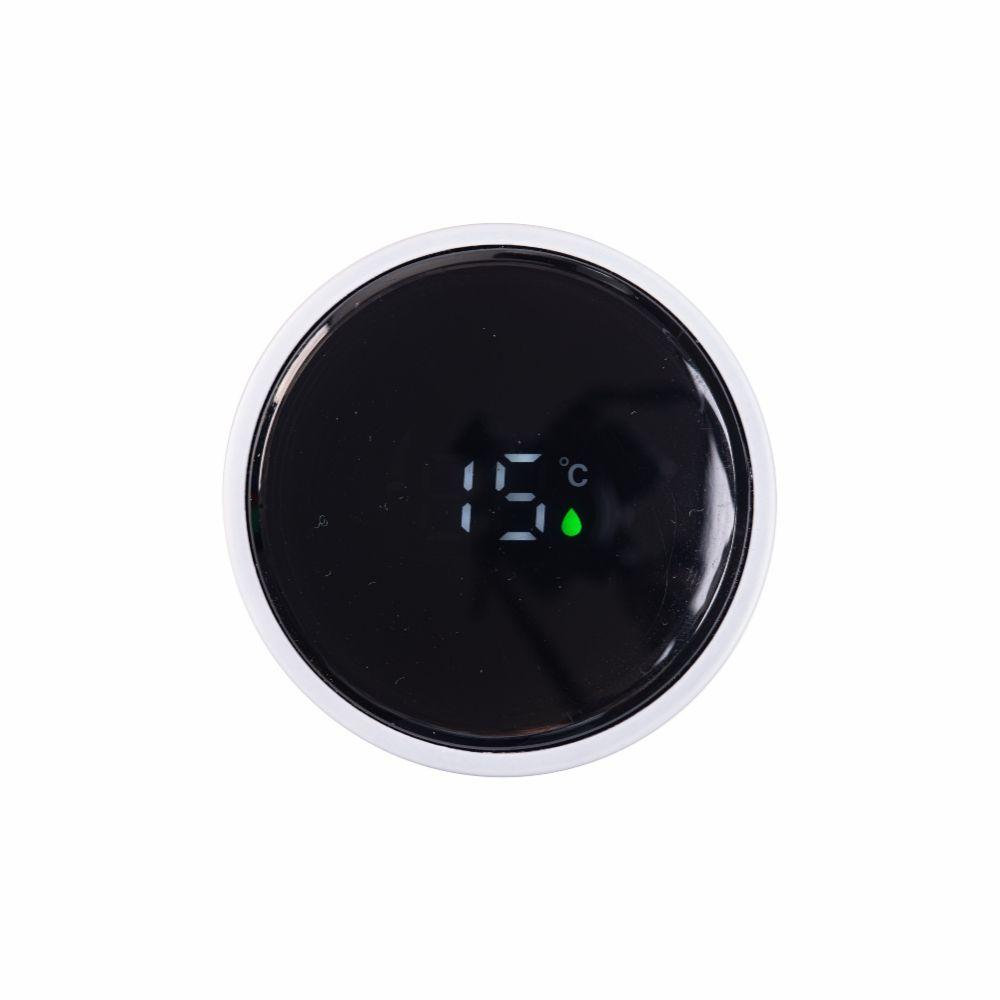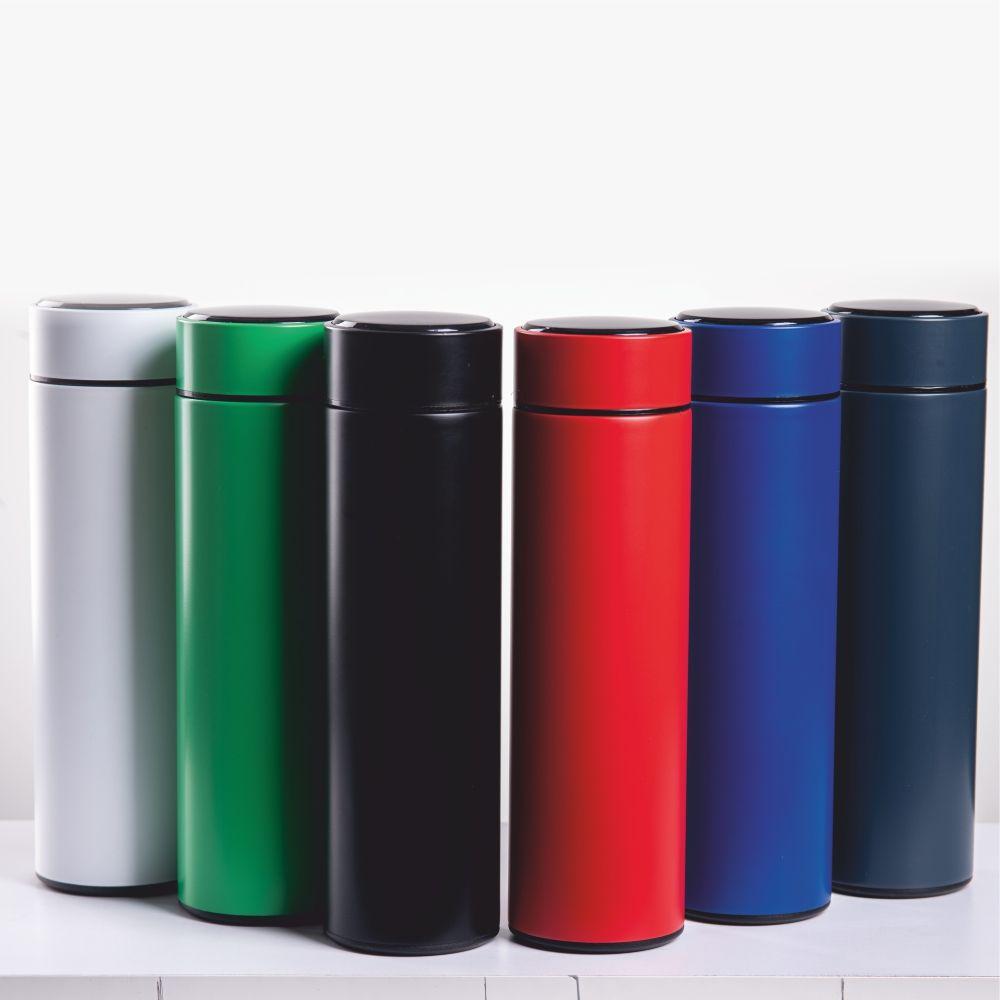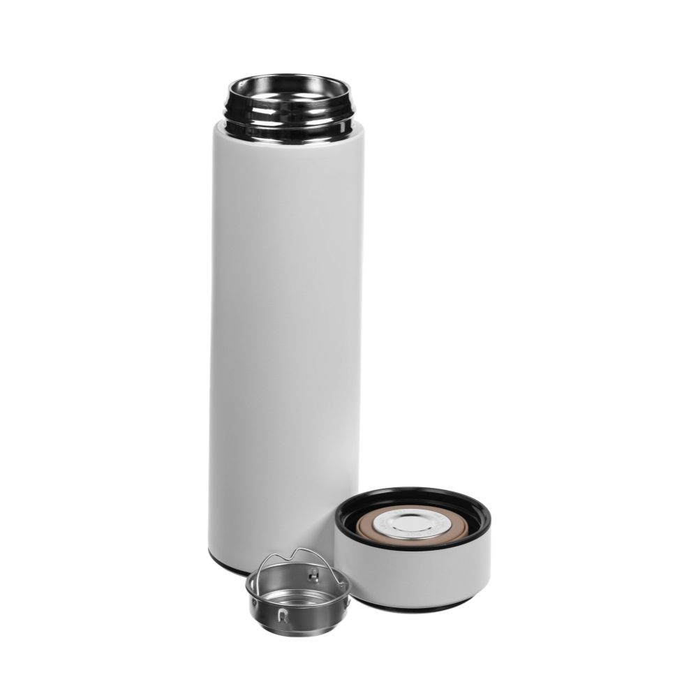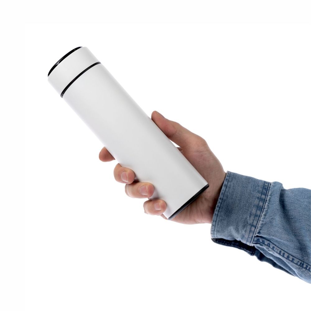 Объем термоса – 500 мл. Крышка оснащена цифровым дисплеем с индикатором температуры, работающим от литиевой батарейки-кнопки CR2032.