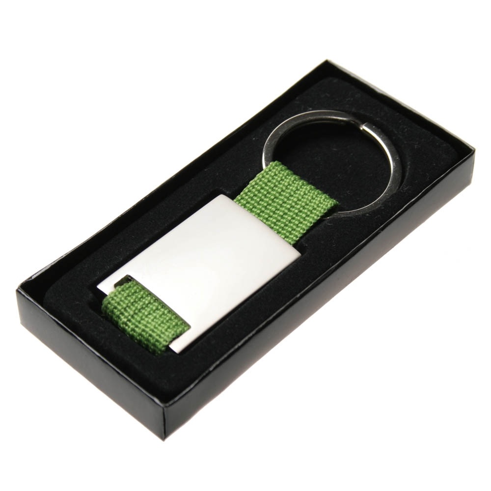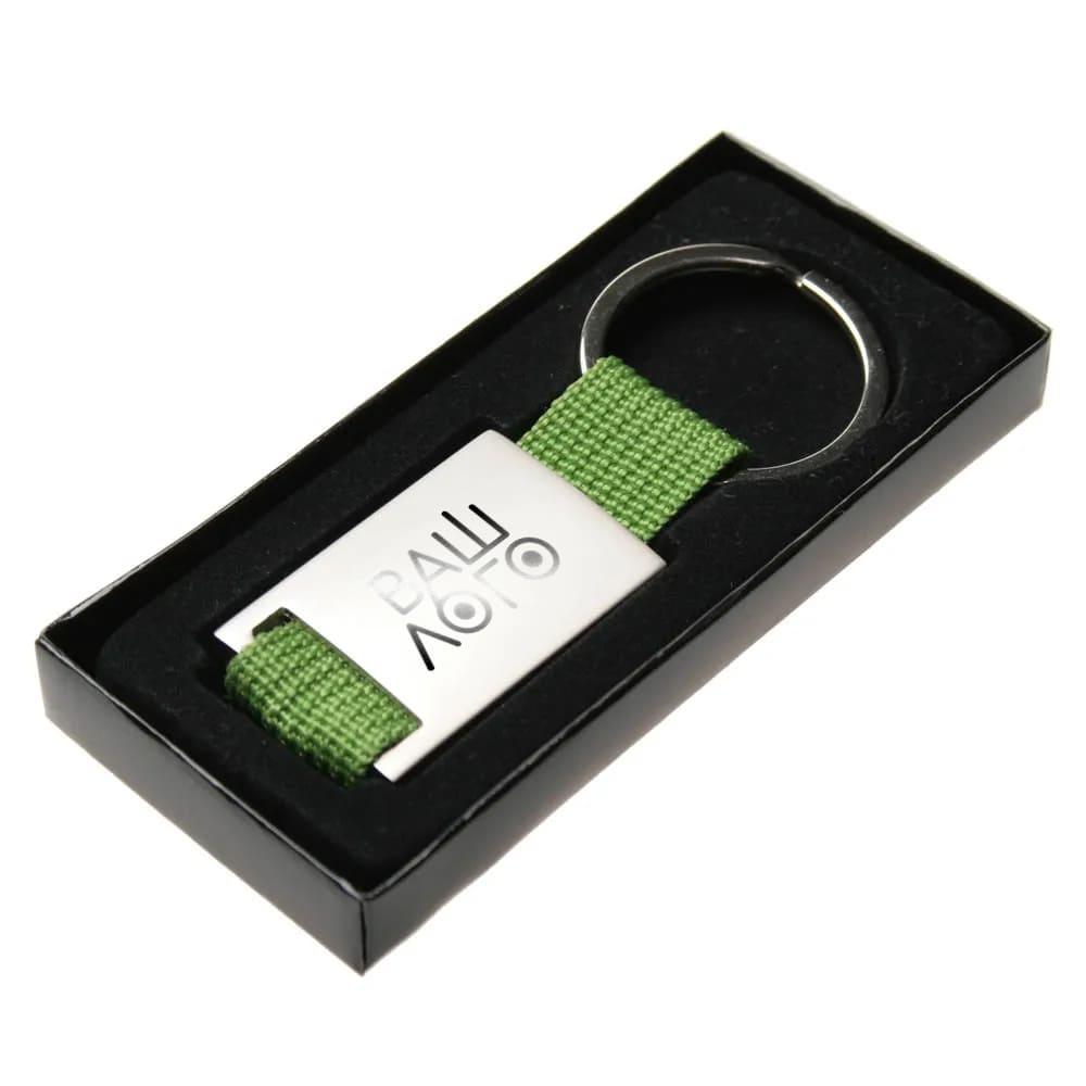 Металевий брелок з тасьмою. Зручний для нанесення зображення методом лазерного гравіювання. Оснащений металевим кільцем для ключів.